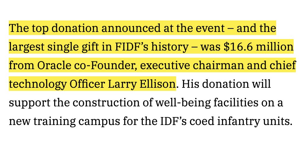 MUST SEE: Larry Ellison, executive chair and CTO of Oracle, speaks about Israel and the Israeli military at a Nov 2014 “Friends of the IDF” gala in Beverly Hills, where he reportedly donated $9 million, making him the event's largest donor. “The renewal of the Jewish state is something that I think touches all of us. For 2,000 years we were a stateless people. And now we have a country of our own, defended by all the brave men and women of the IDF. So anything we can do to support them, who devote their lives for preserving the state of Israel, keeping the people safe, and allowing our state to continue...” “I have been to Israel. I have been to the border. I have spent time [with] the people who govern the state of Israel. And I feel a deep emotional connection to the state of Israel and the Israeli people...” “We've actually acquired a number of Israeli companies. We have two CEOs at Oracle. One's name is Safra Catz, and she was born in Israel. So again, we love the country of Israel and will do everything we can to support the country of Israel...” Asked about the fact that “many people” are criticizing Israel, “especially after the Gaza operation” (again, this is 2014), Ellison says: “It's a difficult situation, isn't it? To conduct military operations around civilians is very difficult. And of course there were tragic — tragedies, and civilians were, ya know, were hurt. That's a terrible thing. But one thing we know for certain: that Israeli army did everything they could to minimize civilian casualties. And in that regard, they've done a much better job than a lot of other armies all over the world throughout history.” At another “Friends of the IDF” gala in Nov 2017, Ellison donated $16.6 million, reported at the time to be the largest single gift in the organization's history.