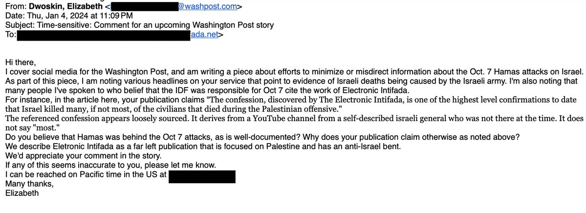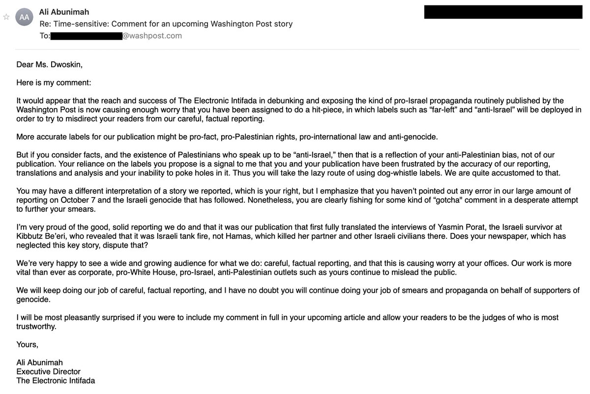 Here's the email she sent @AliAbunimah, and his reply. She says WaPo describes @intifada “as a far left publication” with an “anti-Israel bent.” Ali: “More accurate labels might be pro-fact, pro-Palestinian rights, pro-international law & anti-genocide.”