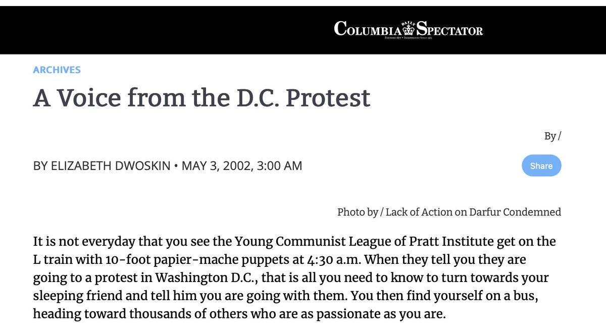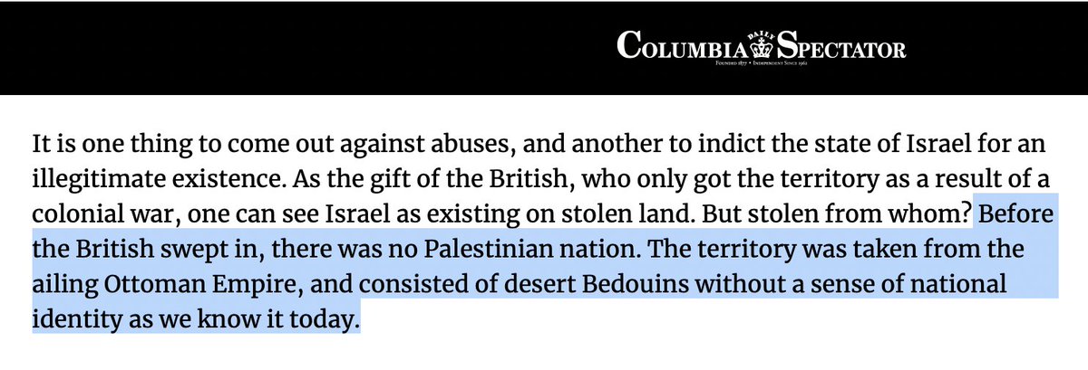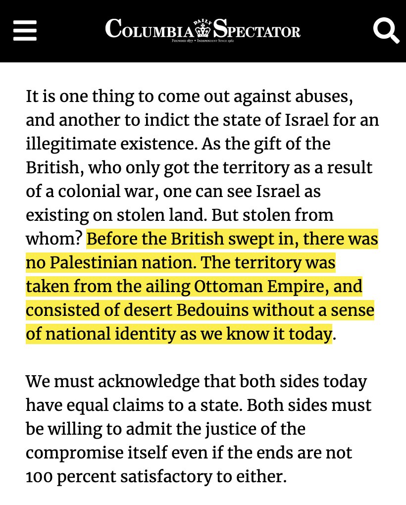 “Before the British swept in, there was no Palestinian nation. The territory was taken from the ailing Ottoman Empire, and consisted of desert Bedouins without a sense of national identity as we know it today.” –Elizabeth Dowskin, May 3, 2002 https://www.columbiaspectator.com/2002/05/03/voice-dc-protest/