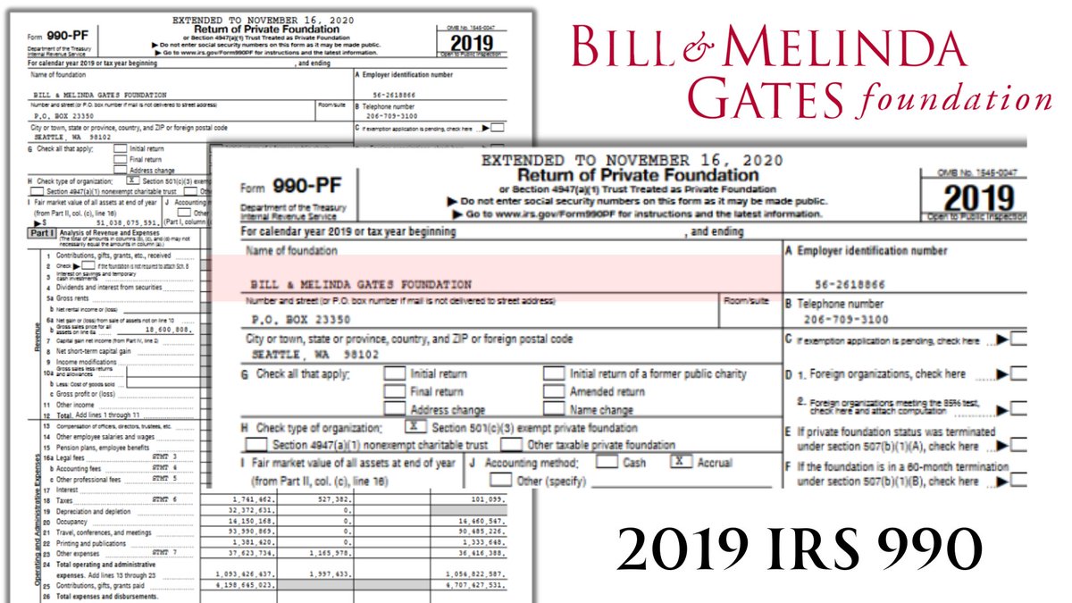 1🧵Covid disrupted life as we knew it & since the first lock-down things haven't been the same. We went into 2020 w/ Bill & Melinda Gates a happily married couple-no more by 2021. I got a hold of their foundations 2019 IRS 990 to see what the happy Ex's were up.