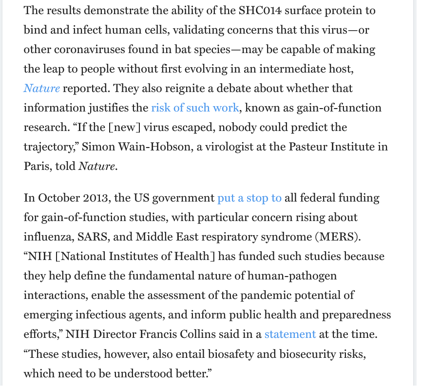 8🧵This WIV-1 research in Montana in 2018, & the WIV-1 research at UNC Chapel Hill in 2016 were NOT the only GoF research involving chimeric CoV's by Ralph Baric. A eye opening article from 2015 published in The Scientist confirms this citing the chimeric strain, SCH014.