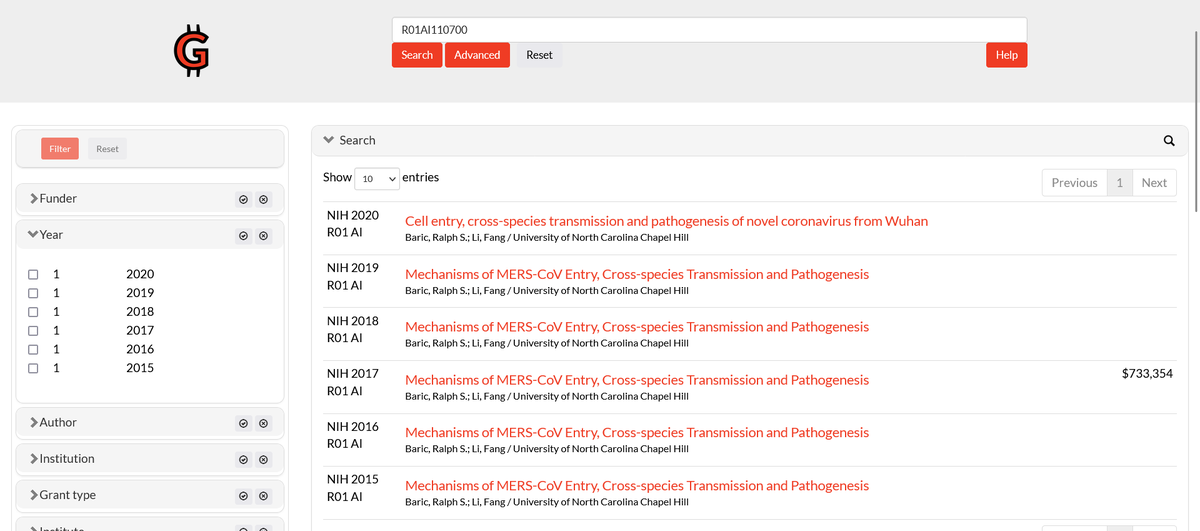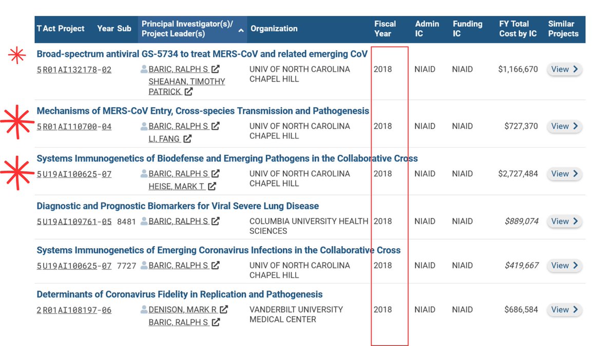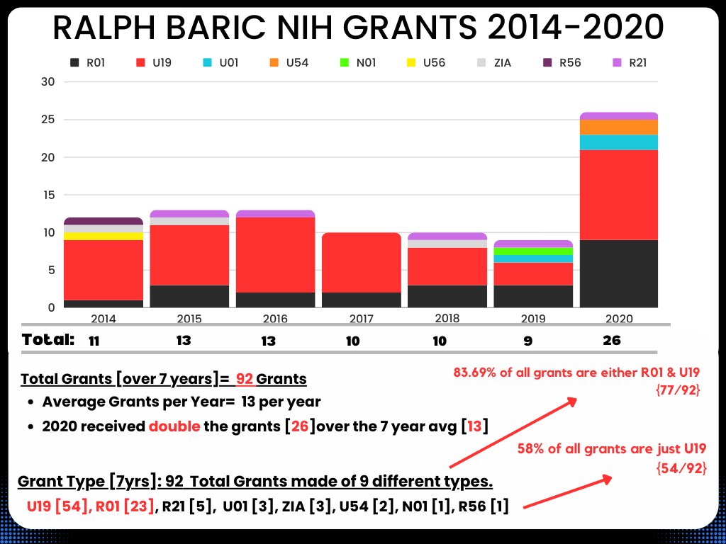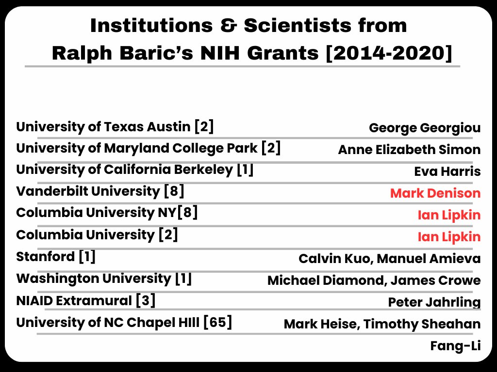 3🧵I looked into Ralph Baric's grant history from 2014-2020. As you can see there was a noticeable increase in NIH grants to Baric when 2020 came around. His top collaborators were Denison [Vanderbilt] & Lipkin [Columbia] in those 7yrs.