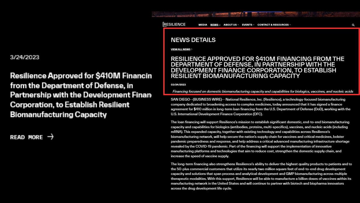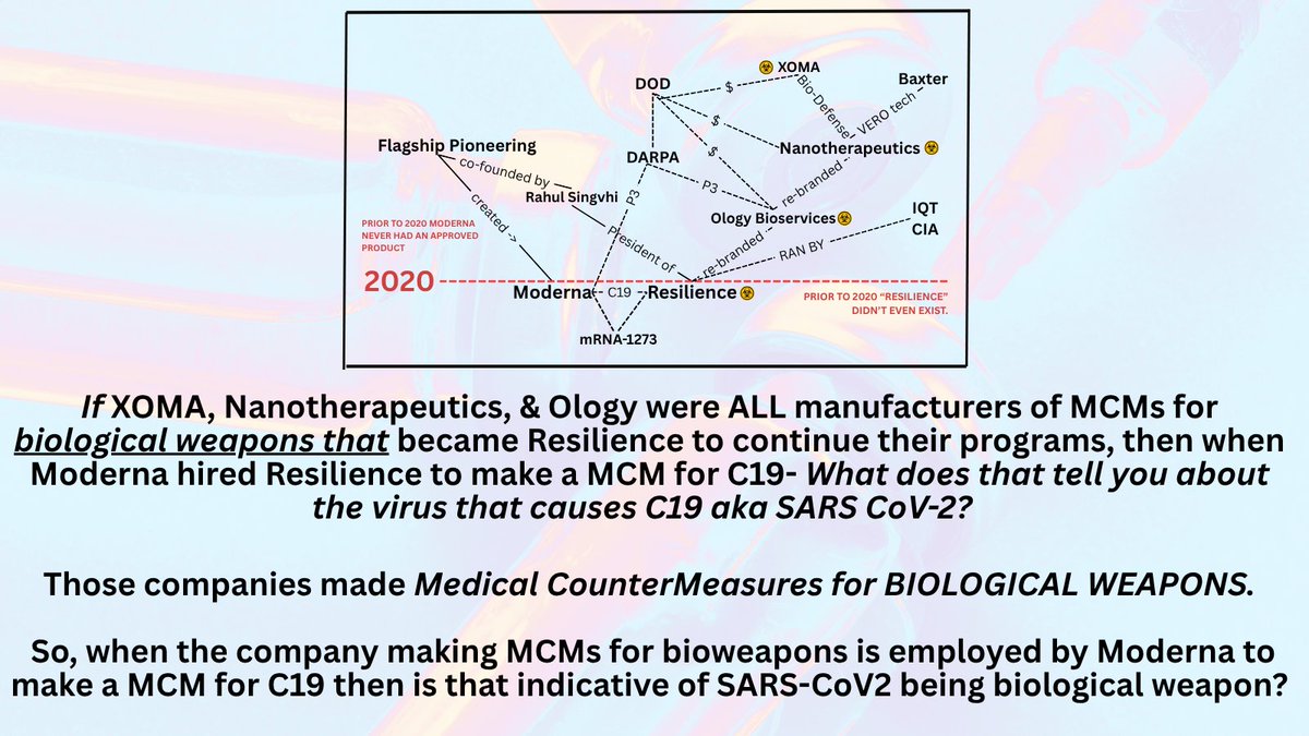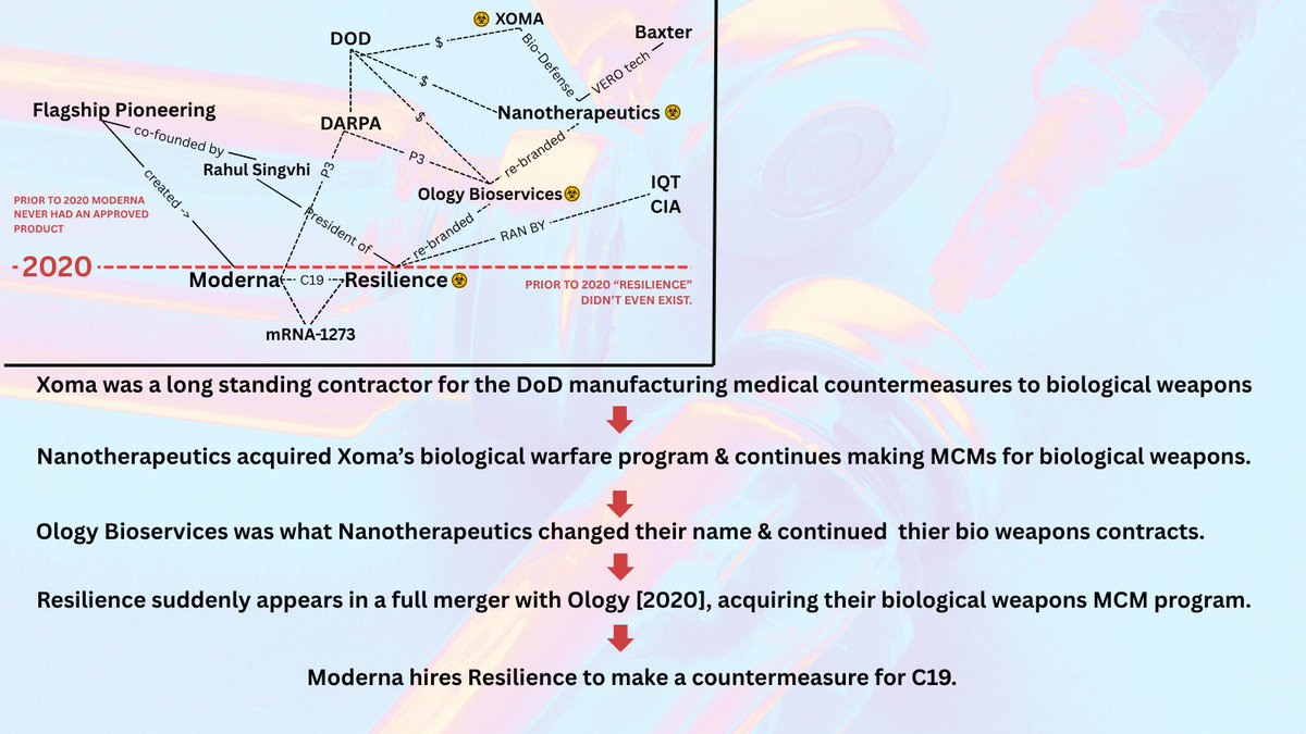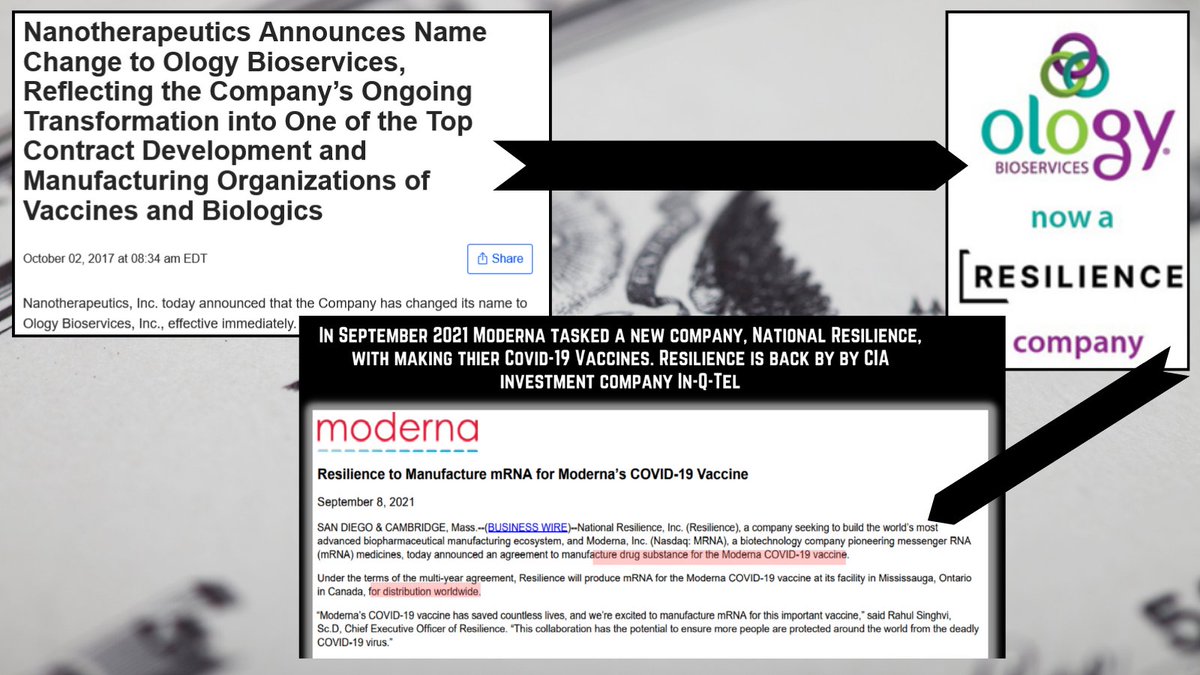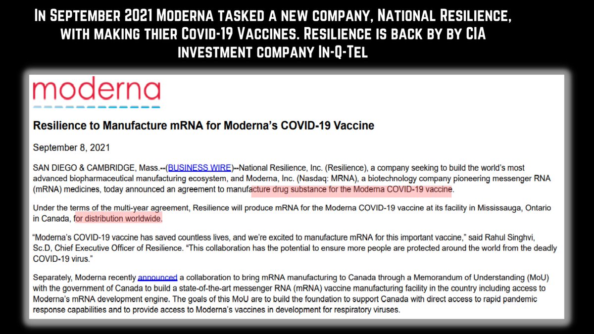 1/10 Back in fall of 2021, Moderna hired and tasked a supposedly new pharmaceutical manufacturing company called National Resilience (Resilience) to make ALL of their Covid-19 vaccines . Resilience is rife with conflict of interest esp. with the intelligence community.