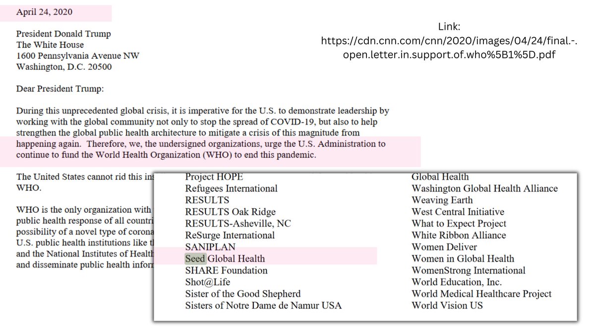 4🧵The branches of unethical actions are vast w/ Dr.Kerry, as her company, SEED GH was among the dozens of companies that pleaded to Trump (in 2020), asking him to resume funding the WHO-her future employer. And again, in a letter to USAID's Samantha Power, seeking funding...