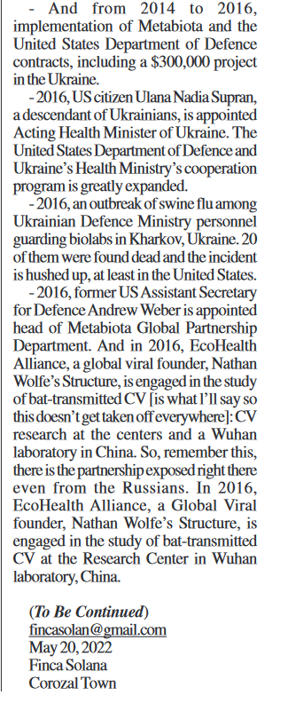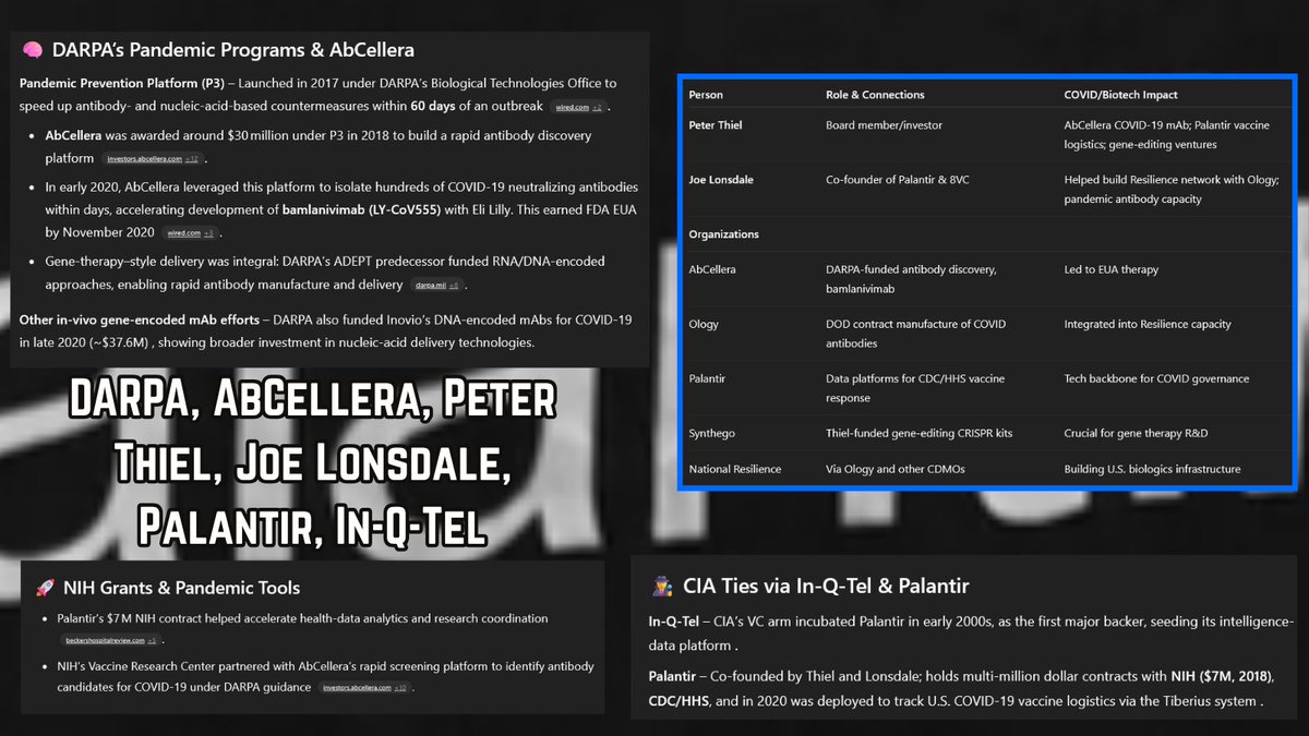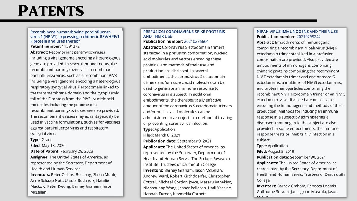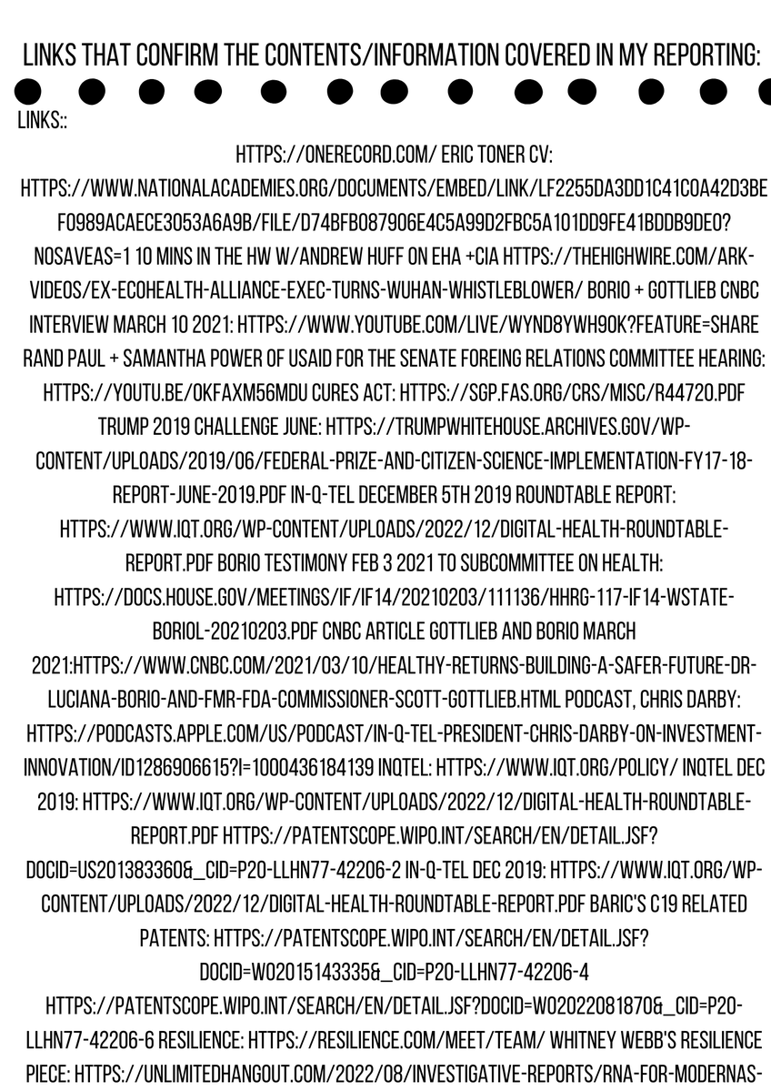 Okay I'm going to just do a data dump. The algorithms are gonna trash this-I know. Views will be low- I know. This isn't for me. This is for posterity. I am a servant of truth. Here's documents you should see: Nipah Virus Vaccine EffortDevens, MA, USA; August 22, 2019— "Crozet BioPharma, LLC (Crozet) announced today a $10.8 million partnering agreement w/ Public Health Vaccines (PHV) to advance the development & manufacture of a vaccine against the Nipah virus". : https://nipahvaccine.com & ^Crozet Biopharma- BIG LEAD- this company is virtually owned by the OneHealth initiative and is behind the Nipah Virus Vaccine along with Public Health Vaccine LLC- Tied to EHA: https://crozetbiopharma.com/_files/ugd/455626_5ecd4533c07c4d908fe43e1fb28b5a9c.pdf Linfa Wang of Duke/UNC Chapel Hill Hendra/SARS/COVID/NIPAH scientist, joint researcher w/ Zhengli Shi 2022: https://globalhealth.duke.edu/sites/default/files/cv/cv-linfa-wang-220202.pdf OFFICE OF INSPECTOR GENERAL Audit 2023: "NIH did not effectively monitor or take timely action to address EcoHealth’s compliance": https://oig.hhs.gov/oas/reports/region5/52100025.pdf CEPI [Founded by Bill Gates, the Wellcome Trust, and the governments of India & Norway] 2021 Portfolio on priority pathogens and Disease X, & to "Invest in Nipah vaccine development through clinical phases of development, w/ an option to advance one vaccine through licensure if deemed feasible in the future." https://cepi.net/wp-content/uploads/2022/06/CEPI-Portfolio-Review-Meeting-2021-Website-summary-FINAL_participants-appendix.pdf Nipah virus vector sequences in COVID-19 patient samples sequenced by the Wuhan Institute of Virology Article by Dr. Steven C. Quay "the discovery of NiV sequences in COVID-19 patient BALF samples as a NiV co-infection, here we document NiV genes contained in synthetic vectors, which we infer was for assembly of a NiV infectious clone. Significant contamination is evident throughout the MGISEQ-2000RS platform sequenced data, in particular sample WIV07-02 which contains c. 54% bacteria and higher Influenza A virus HA gene in pVAX1 plasmid sequence levels than SARS-CoV-2 reads" https://arxiv.org/ftp/arxiv/papers/2109/2109.09112.pdf Archived Data on Morbidity/Mortality of Nipah Virus Cases from 2001-2018: https://web.archive.org/web/20180613144643/http://www.searo.who.int/entity/emerging_diseases/links/morbidity-and-mortality-nipah-sear-2001-2018.pdf?ua=1… My Thread of the CIA's infiltration of USAID out of the mouth of RFK jr on Tucker and how it relates to the ONEHEALTH initiative & C19: https://twitter.com/dezzie_rezzie/status/1694115383714644148?s=46&t=fbExOAlHJ2VpZlTuKjSMcA… Johns Hopkins Center for Health Security at the behest of Fauci's Global Health Preparedness Monitoring Board {GPMB} in their paper written September 2019 "Preparedness for a High-Impact Respiratory Pathogen Pandemic Center for Health Security." The lead writer was Eric Toner [same for Event 201, and In-Q-Tels December 5th Roundtable {https://iqt.org/wp-content/uploads/2022/12/Digital-Health-Roundtable-Report.pdf } on Digital Health and a Future Pandemic] This JHCHS (johns hopkins) paper for the GPMB shows a coronavirus on the cover, predicts the pandemic, was one month before Event 201, and even detailed a lab-leak scenario. MUST READ! FAUCI LED THIS! https://centerforhealthsecurity.org/sites/default/files/2023-02/190918-gmpbreport-respiratorypathogen.pdf The US Embassy's documentation of Covid-19 Testing Laboratories in Ukraine: https://ua.usembassy.gov/wp-content/uploads/sites/151/COVID-testing-facilities.pdf SEC Filing from Gingko Bioworks discussing thier collaboration with Hunter Biden's Metabiota {funded by USAID} on Concentric and Baktus ** Direct Quotes: "On August 17, 2022, we issued a total of 2,587,819 shares of our Class A common stock to Baktus, Inc., valued at approximately $8.4 million, as consideration in connection with the acquisition of certain epidemiological data infrastructure assets from Metabiota, Inc., a subsidiary of Baktus, Inc." & "If any of our intellectual property becomes subject to any of the rights or remedies available to the U.S. government or third parties pursuant to the Bayh-Dole Act, this could impair the value of our intellectual property and could adversely affect our business." & "The use of digital genetic sequence information may be subject to the Nagoya Protocol, which could increase our costs and adversely affect our business" {pg69-70} https://s28.q4cdn.com/823357996/files/doc_financials/2022/q3/a97edffd-7cf0-46c0-9d25-af502a33638c.pdf Monoclonal Antibody Work with the NSF and Ralph Baric: https://par.nsf.gov/servlets/purl/10293263 Yahoo Finance on Gingko+Emergent+Metabiota=Concentric+Baktus an effort to test kids for genomic data-Cathie Wood article on acquisition of the company from August 2022: https://yahoo.com/video/cathie-wood-favorite-ginkgo-bioworks-163427950.html?guce_referrer=aHR0cHM6Ly9lbi53aWtpcGVkaWEub3JnLw&guce_referrer_sig=AQAAADwKGZ2yjBN4_Xfq_pP41IbT78hkw9Y50JJyNZn35xhSsMqlOVimal4kK9OzxXS3dkL9o2WH6zl5KQqQXu8r03-G6WBT88BPiXYJ0gSEU2ZpCkkk9WYNLjRaSq0PsWCPJIjJ5G0wdr2X7yztB1TFB0sFSGLhnG-xRP23Js4ElNVU&guccounter=2… BSL Laboratory Interactive Map: https://globalbiolabs.org/map Global Disease Surveillance Map: https://outbreaks.globalincidentmap.com One Last thing!!! I love you. You're awesome. Don't Give Up! I believe in Human-kind, be both.