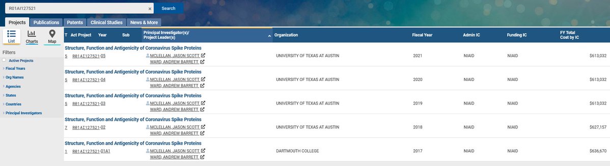 3🧵On Feb 09 2017 The NIH began a grant round titled: "Structure, Function & Antigenicity of Coronavirus Spike Proteins" led by McLellan & Ward out of Dartmouth. The grant # is R01AI127521 & went 5 grant cycles from 2017-2021.