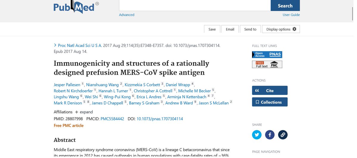 4🧵W/in the NIH grant rounds under R01AI127521 a publication was funded. That paper, "Immunogenicity & structures of a rationally designed prefusion MERS-CoV spike antigen" was authored by not only Graham, Ward + McLellan but also Corbett & Denison👀