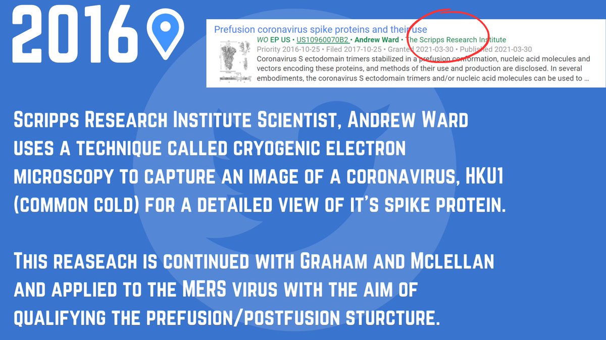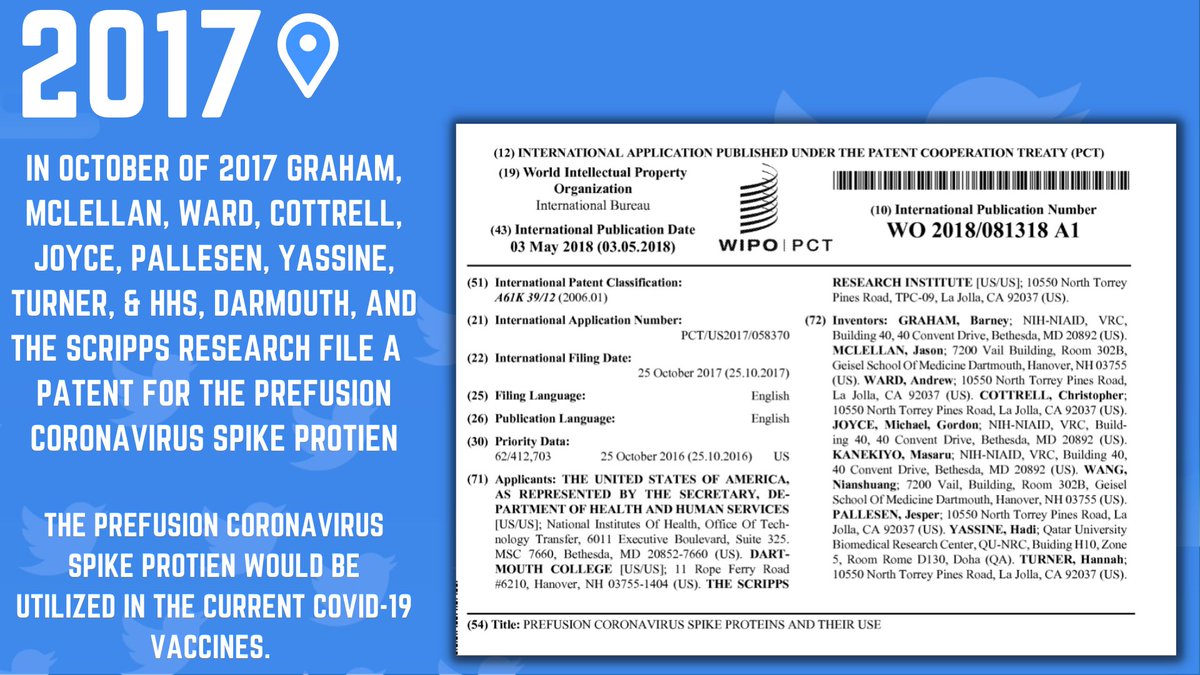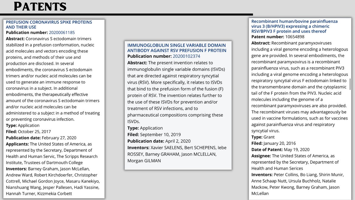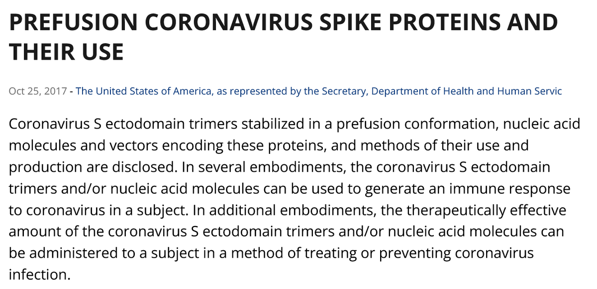 6🧵Two months after the "...prefusion MERS-CoV spike antigen" article a patent was issued on Oct 25 2017 titled: "PREFUSION CORONAVIRUS SPIKE PROTEINS AND THEIR USE" credited to HHS, Scripps and Dartmouth w/ Ward, McLellan, Graham & Corbett. This patent is credited 4 the C19 💉
