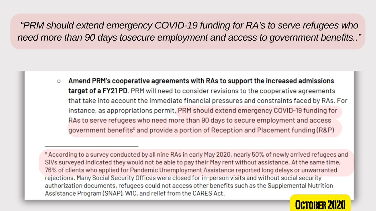 5🧵Another suggestion in the paper was that the Bureau of Population, Refugees & Migration "should extend emergency Covid-19 funding for Refugee Admissions to serve refugees who need more than 90 days to secure employment & access government benefits"