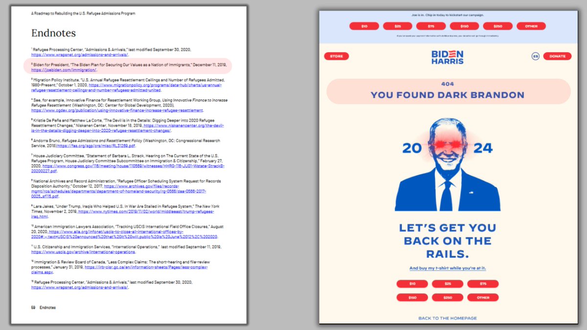 6🧵At the Endnotes of the paper, second in the references, was a citation for a Biden 2020 campaign website on immigration. Which is no longer there & in it's place was a ultra creepy "Dark Brandon" image asking for donations w/laser eyes...