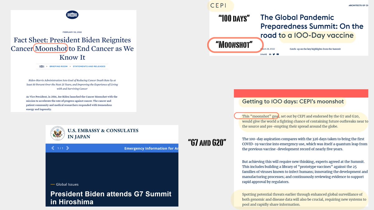 9🧵In both papers the term , "In the first 100 days" appears- reminds me of Biden Admin's kick off of the "first 100 days" of the vaccine in 2021, & in 2022 CEPI announced their "100 days" vaccine agenda which they call their "moonshot" just like Biden's Cancer Initiative. 🤔