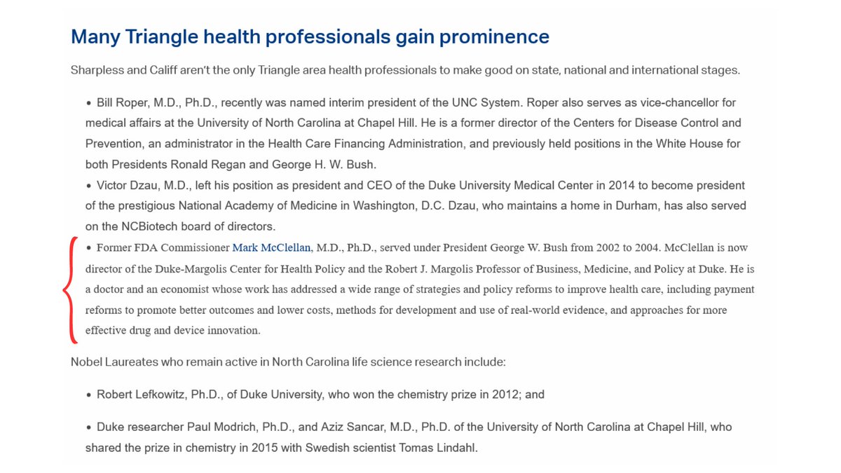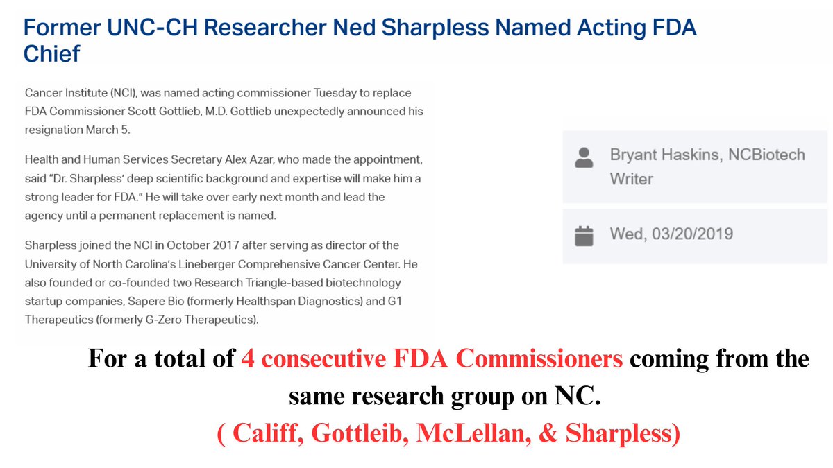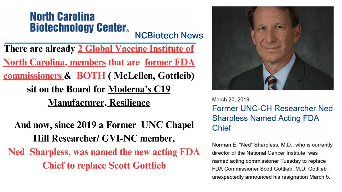 13🧵Global Vaccine Inc, funded for producing adjutants for CoV vaccines, is from NC & works in tandem w/ UNC-CH, & Duke as a consortium called #NCBiotech. 4 of the recent FDA commissioners are members, 2 are on Resilience's board currently.