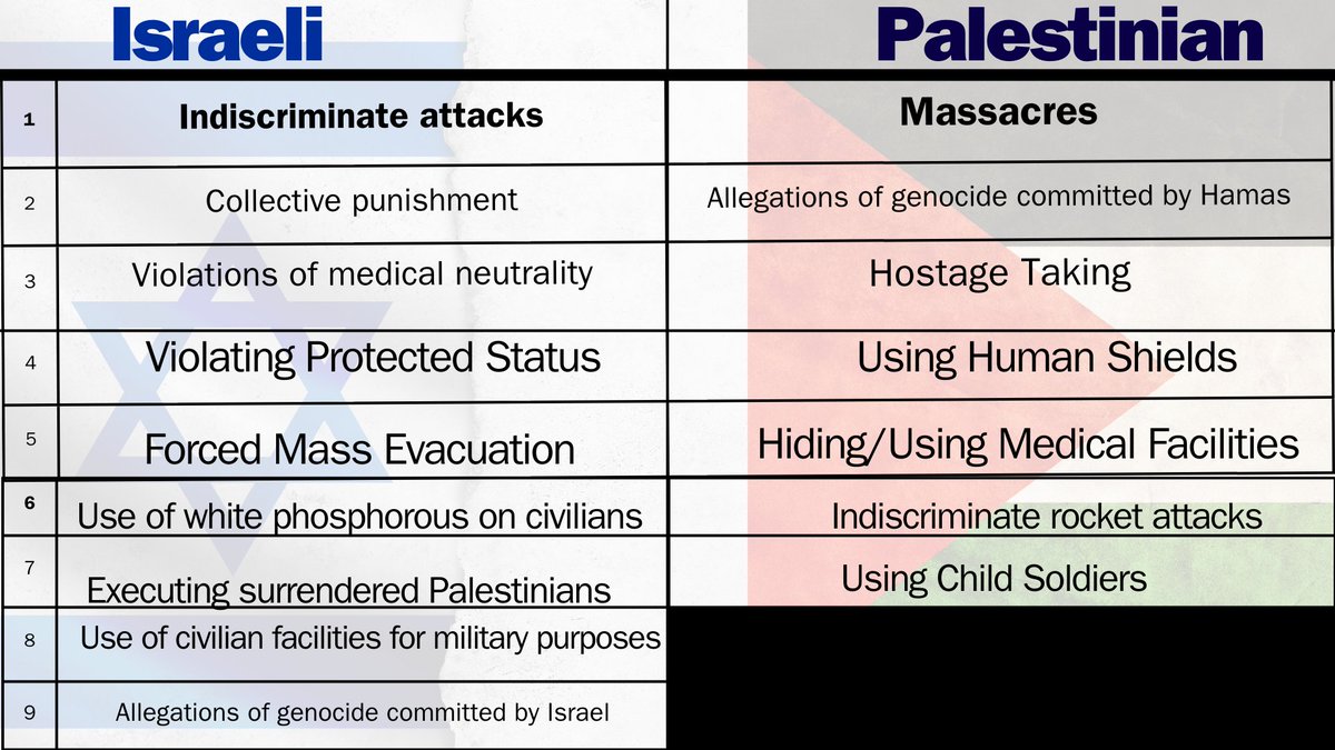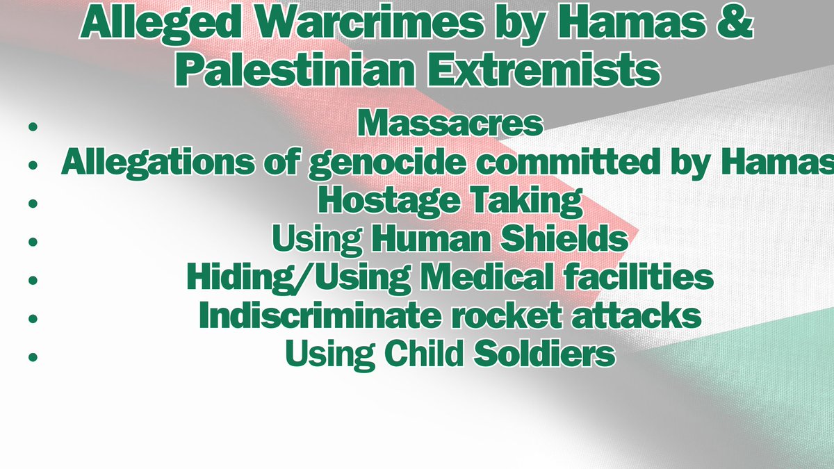 🇵🇸🚫War Crimes allegedly committed by Hamas: Massacres, Genocide, Hostage taking, Using human Shields, Hiding in medical facilities, Indiscriminate Rocket attacks & using Child Soldiers. || 7 total specifically claimed war crimes by Hamas. https://t.co/aaPDqQLNPk