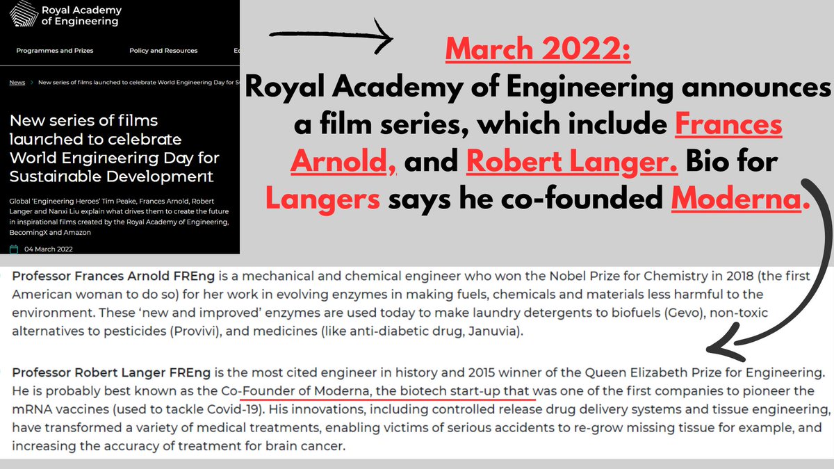 3/5 🧵 March 2022, Arnold, was featured in a series of films by the Royal Inst. alongside another Fellow, Robert Langer. Langer is the co-founder of Moderna, the company that hired Resilience to make their C19 vax since 2021. 🤔