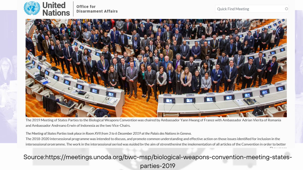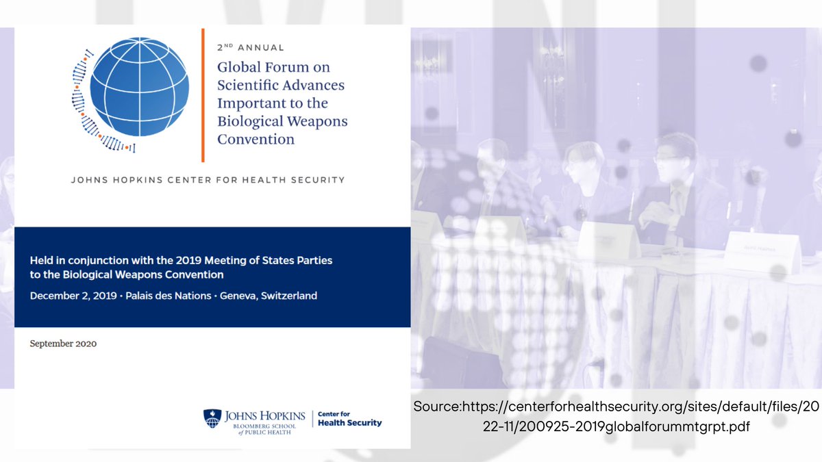 4🧵The Global Forum on Scientific Advances Important to the Biological Weapons Convention [BWC]-cosponsored by the UN's Office for Disarmament Affairs [BWC/UNODA] held Dec 3-6th 2019 w/ a conference by JHCHS on Dec 2 2019.