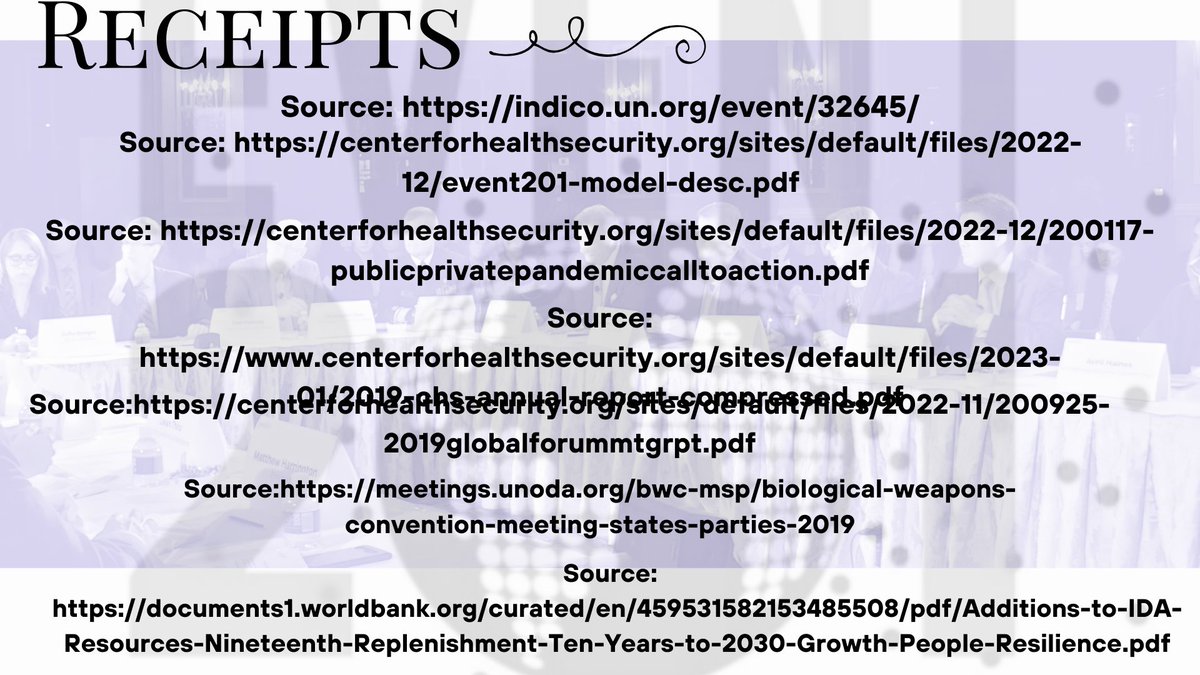 Links and Threads: 911media.de/pdfs/Center%20… New Event 201🧾: https://centerforhealthsecurity.org/sites/default/files/2022-12/event201-model-desc.pdf https://centerforhealthsecurity.org/sites/default/files/2022-12/finance-fact-sheet-191009.pdf https://centerforhealthsecurity.org/sites/default/files/2022-12/200117-publicprivatepandemiccalltoaction.pdf https://www.centerforhealthsecurity.org/sites/default/files/2023-01/2019-chs-annual-report-compressed.pdf https://centerforhealthsecurity.org/our-work/tabletop-exercises/event-201-pandemic-tabletop-exercise https://disarmament.unoda.org/biological-weapons/about/latest-information/news-from-2019/ https://indico.un.org/event/32645/ https://documents-dds-ny.un.org/doc/UNDOC/GEN/G19/337/88/PDF/G1933788.pdf?OpenElement https://undocs.org/Home/Mobile?FinalSymbol=BWC%2FMSP%2F2019%2FINF.1&Language=E&DeviceType=Desktop&LangRequested=False