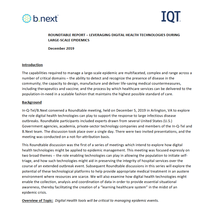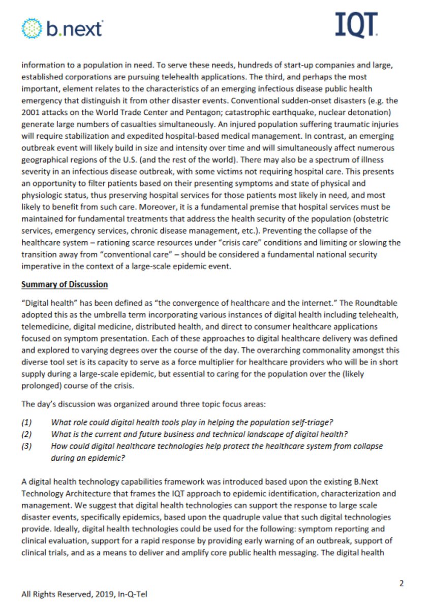 2 🧵The report was written in Dec.2019 by the CIA's venture capital arm, In-Q-Tel & was a summary of their round-table meeting held Dec 5th 2019 titled; LEVERAGING DIGITAL HEALTH TECHNOLOGIES DURING LARGE-SCALE EPIDEMICS