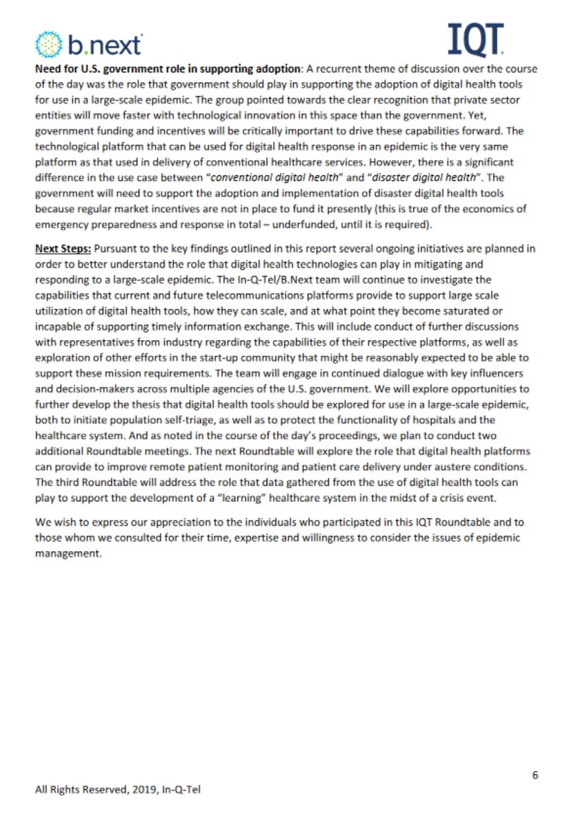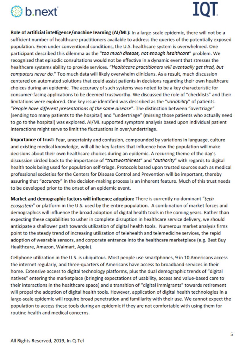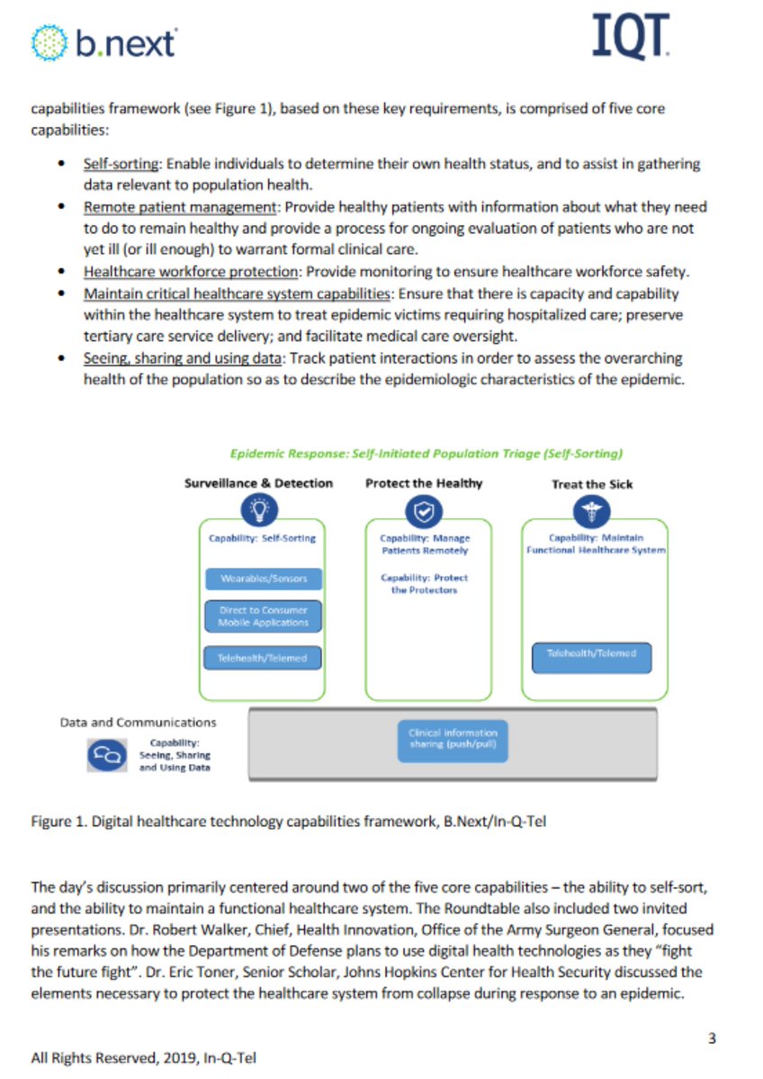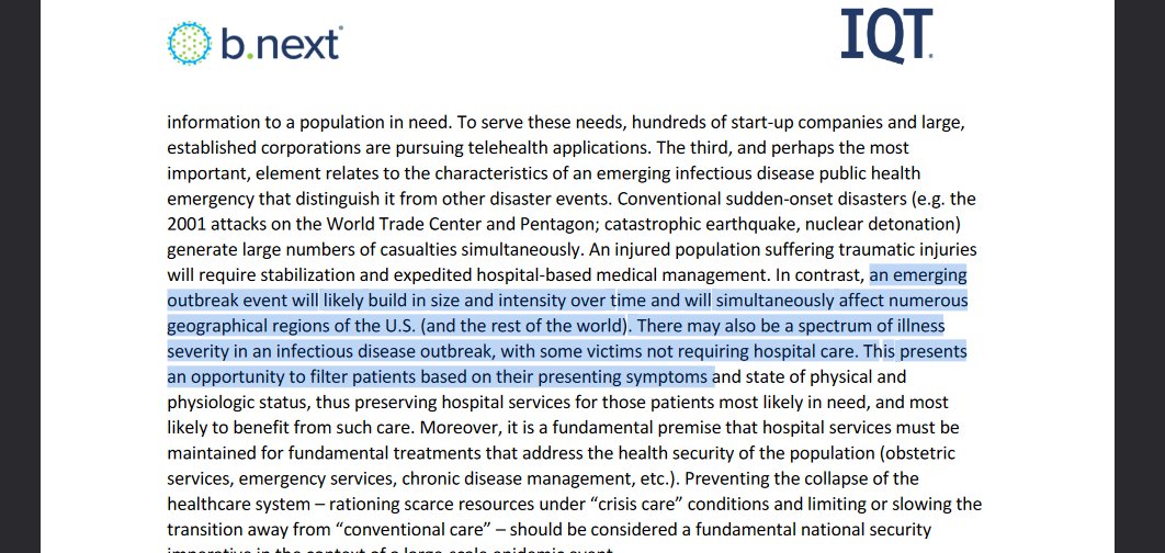 6🧵In-Q-Tel repeated the need for: track and trace technology, digitalized health care system, implementing "tel-health" over hospital trips, wearable sensors, at home testing, & even REFUSING patients who weren't, "ill enough to warrant formal clinical care"