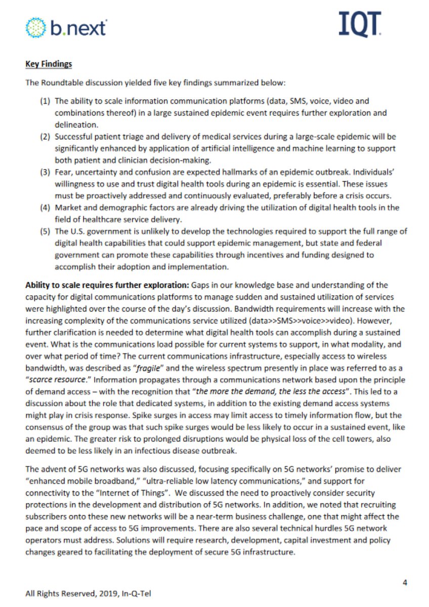 3🧵The report describes the need to prepare for a "large scale" pandemic & the need to create a "living healthcare system" & the importance of rapidly deployable "medical countermeasures." They note that the newly implemented 5G would help achieve these goals.