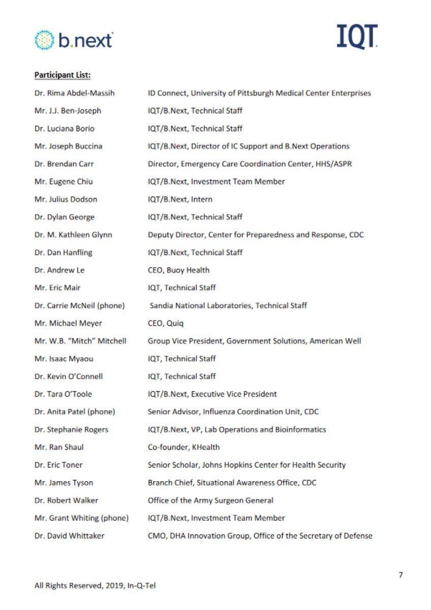 8🧵On the very last page of the 7pg report, they've listed the Participants. Most notable: Tara O'Toole & Luciana Borio. Both In-Q-Tel officials. On page 3, they also named 2 guest presenters; Dr. Robert Walker {Army Surgeon Gen} & Eric Toner {JohnsHopkins}