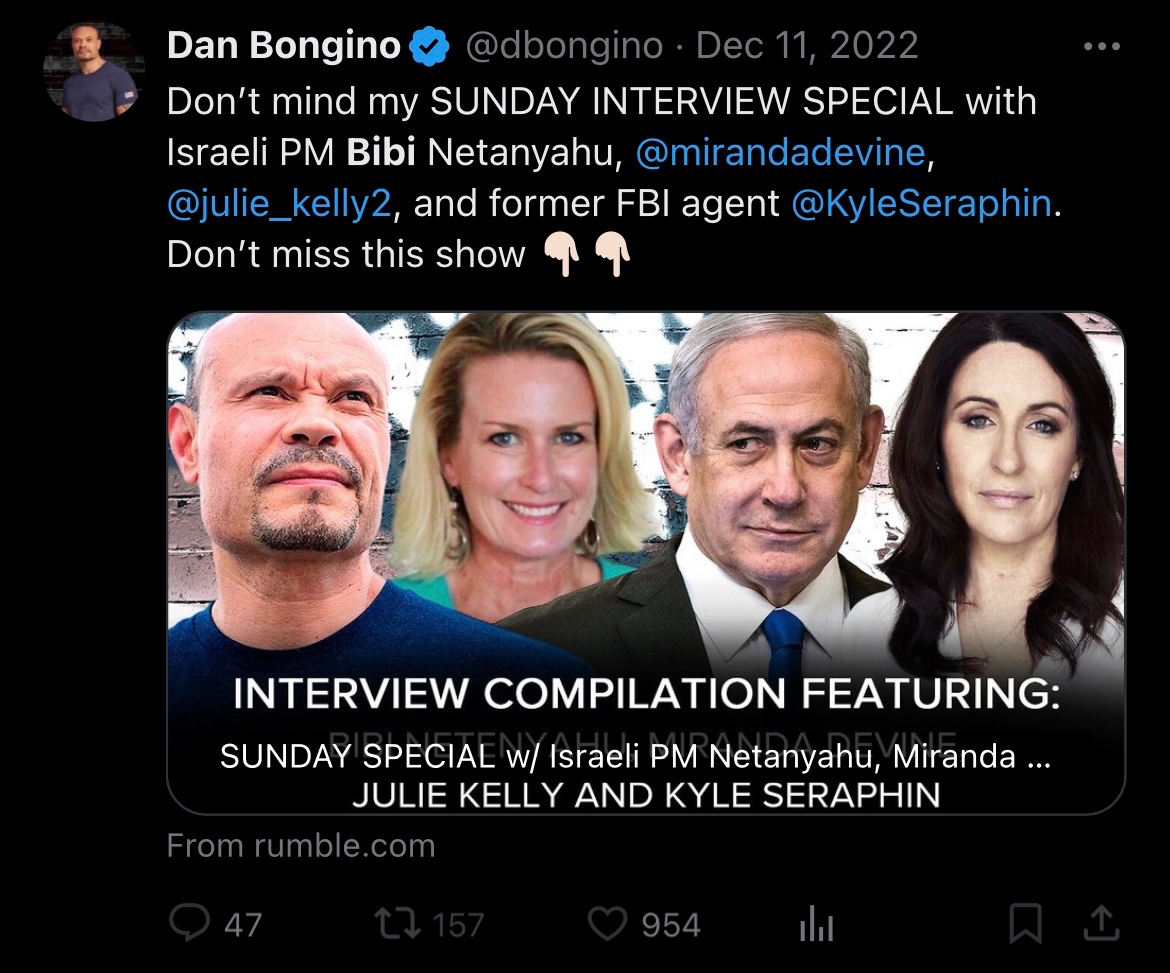 No wonder @dbongino hates Patriots! He’s friends with international wanted criminal and Zionist, Bibi Netanyahu! It all makes so much sense! https://t.co/TqUhoRTnAA