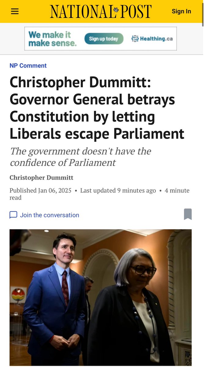 “The Governor General’s decision to allow a prorogation is a betrayal of the essence of Canadian democracy. Intentionally or not, she has allowed herself and her office to be used as the Liberal party’s stool-pigeon… The prime minister’s request for prorogation permits him to flee Parliament. He would be trying to escape the wishes of the people and their representatives. This is the moment for which we provide the special reserve powers of the governor general — to prevent a government from running away from the will of the people’s representatives.” We need some very serious reforms in this country so that this never happens again. https://nationalpost.com/opinion/christopher-dummitt-governor-general-betrays-constitution-by-letting-liberals-escape-parliament