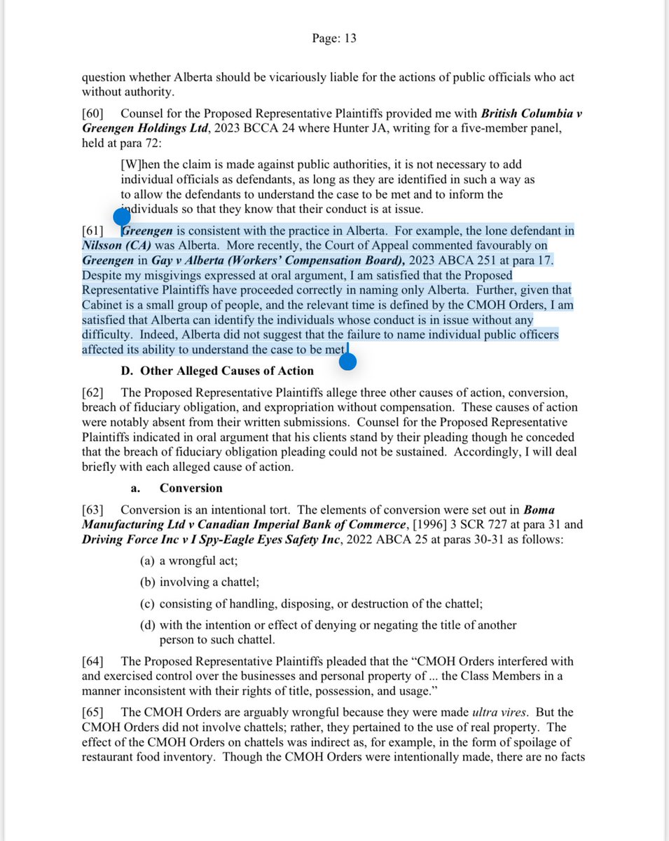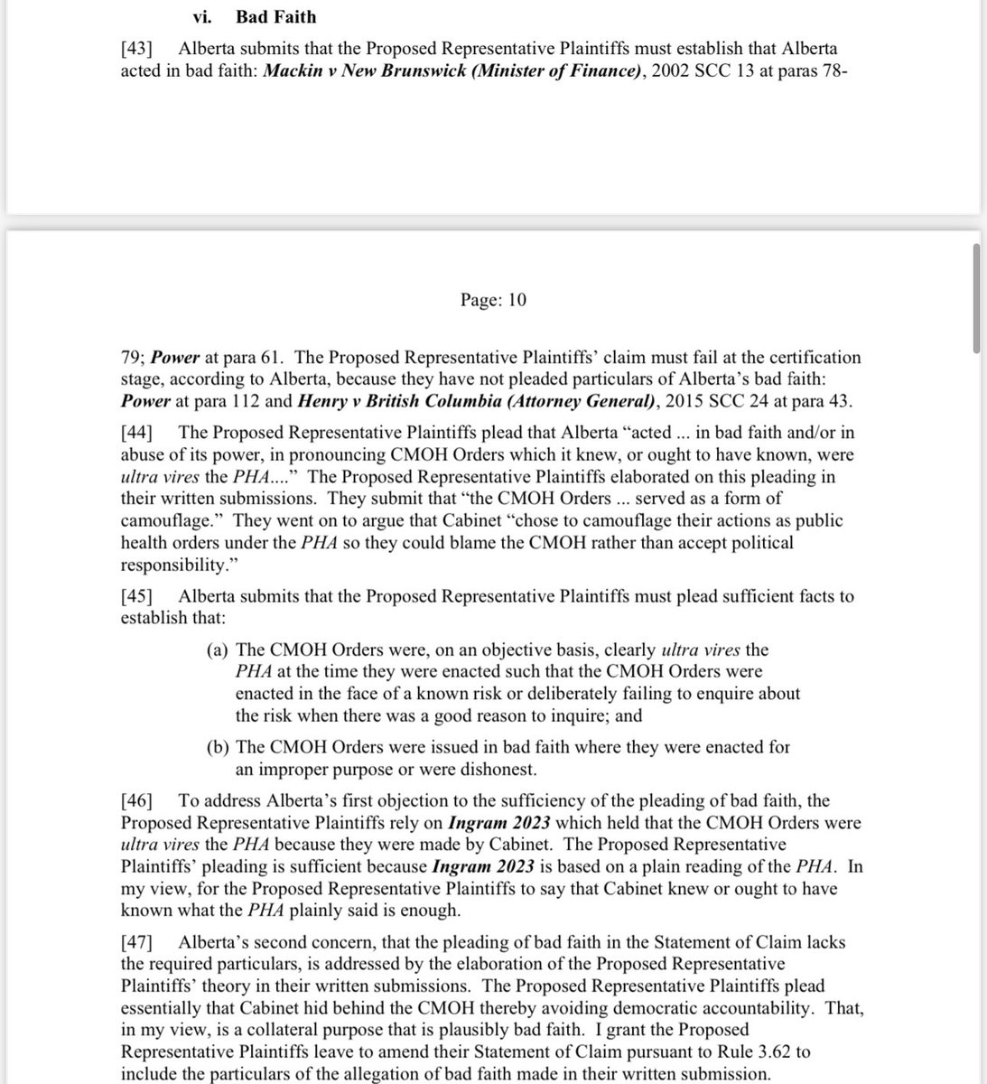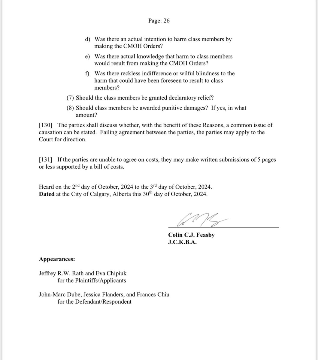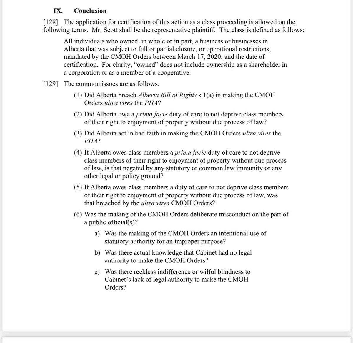 FOR IMMEDIATE RELEASE - Rath & Company is pleased to announce today that it has been successful in its application for certification on behalf of Alberta business owners impacted by Covid-19 restrictions and closures imposed through Chief Medical Officer of Health (“CMOH”) Orders. Justice Feasby of the Court of King's Bench of Alberta released his decision today certifying the class action in Ingram v Alberta, 2024 ABKB 631. This class action, led by Rebecca Ingram and Christopher Scott (the “Proposed Representative Plaintiffs”), sought to certify a class on behalf of affected Alberta business owners who suffered losses due to the CMOH orders, which were found to be ultra vires—outside legal authority and therefore unlawful—under Alberta’s Public Health Act (“PHA”) in Ingram v Alberta (Chief Medical Officer of Health), 2023 ABKB 453 (“Ingram 2023”). As a result, the Court Certified multiple claims, including negligence, bad faith and misfeasance in public office. The Court allowed affected businesses to claim compensation for harm and losses incurred due to the illegal CMOH Orders including punitive damages. Central Allegations of Bad Faith and Call for Punitive Damages A core component of the case was the allegation that Alberta’s Cabinet acted negligently or in bad faith by issuing orders through the CMOH when Alberta’s Cabinet chose to camouflage their actions as public health orders under the PHA so they could blame the CMOH rather than accept political responsibility.” Specifically, Justice Feasby found: “The Proposed Representative Plaintiffs plead essentially that Cabinet hid behind the CMOH thereby avoiding democratic accountability. That, in my view, is a collateral purpose that is plausibly bad faith.” The Court expressly permitted claims for punitive damages to hold Alberta accountable and deter future misconduct. Justice Feasby agreed that this is a reasonable common issue and certified it for consideration. Unlike general damages, which require individual assessments, punitive damages can be addressed as a common issue when the misconduct affects a broad group. Specifically Justice Feasby acknowledged that punitive damages are intended to punish wrongful conduct rather than compensate for losses, and can sometimes be assessed on a class-wide basis. The Court has certified a class consisting of: “All individuals who owned, in whole or in part, a business or businesses in Alberta that was subject to full or partial closure, or operational restrictions, mandated by the CMOH Orders between March 17, 2020, and the date of certification. For clarity, “owned” does not include ownership as a shareholder in a corporation or as a member of a cooperative.” Lead counsel Jeff Rath stated: “This is a huge day for Alberta businesses that were illegally harmed by Jason Kenny and Deena Hinshaw. The Court found that the action can proceed against the government of Alberta on a number of grounds including misfeasance in public office allowing the plaintiffs to seek punitive damages against the Alberta government for wrongdoing.” Important Notice for Potential Class Members The application for class action certification seeks to provide a fair and efficient resolution for Alberta business owners who suffered losses due to the CMOH Orders. A class proceeding is the most effective way to address these claims, given the widespread impact on Alberta’s business community. If you believe you are a class member, please retain all relevant records, as this evidence will be essential in the upcoming steps. For more information and updates on this case, or to complete our intake form if you believe you are a class member, please visit: https://rathandcompany.com/business-class-action/