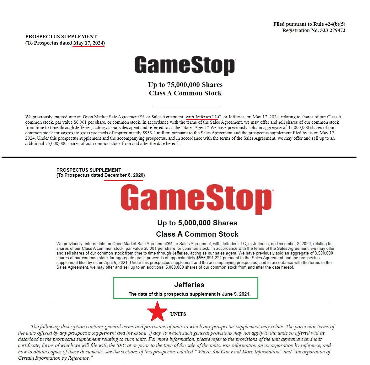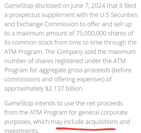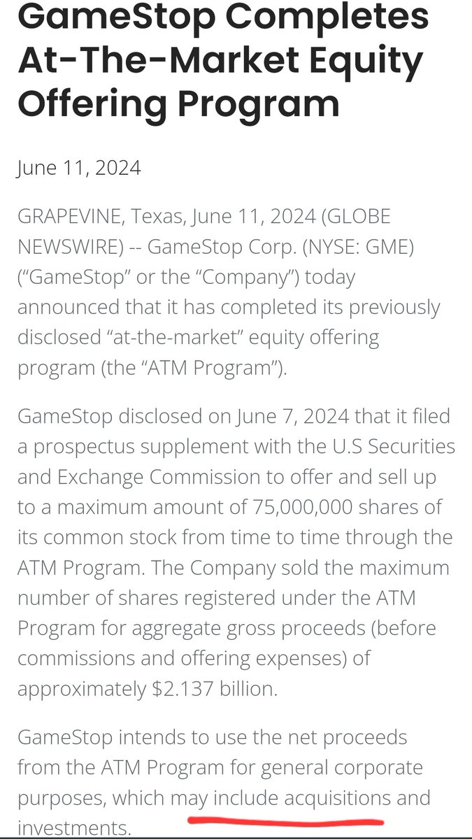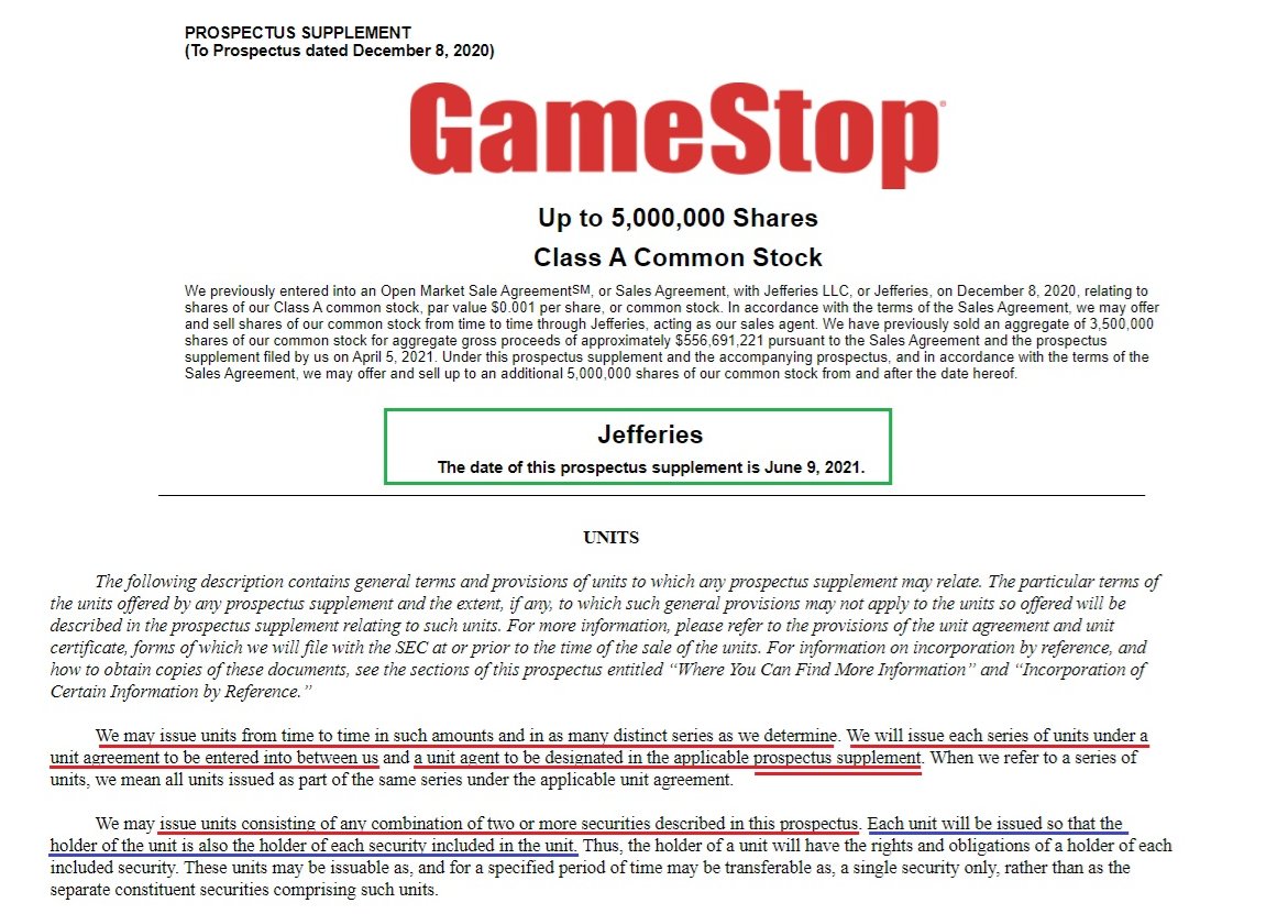 $GME 75M share at-the-market offering is now complete via Jefferies, the investment bank and agent handling the Units between all of the target M&A companies. Jefferies has been involved since Units was first mentioned on June 9, 2021: @ryancohen is the Executive Chairman and has the authority to make acquisitions and investments with a $4 Billion dollar war chest. The filing from today states exactly that: Do you think he will do it? Nothing Can Stop What Is Coming MGGA x MAGA #GMERICA ๐บ๐ธ