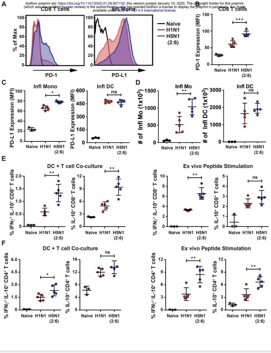 6) In conclusion, hyperactivation of the innate immune response by H5N1 impairs T cell responses and delays viral clearance by inducing inhibitory mechanisms like PD-1 and IL-10. This helps explain the severe disease associated with H5N1 infections. https://t.co/AjetggWSpe