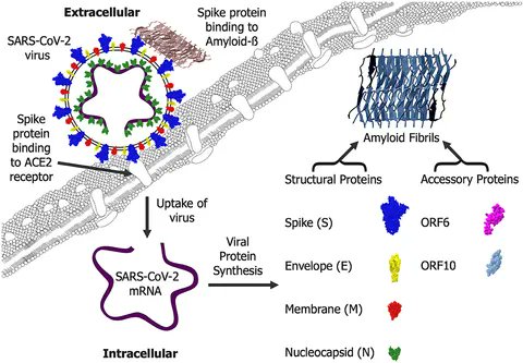 2) SARS-CoV-2 contains amyloid-forming proteins that could contribute to COVID-19-exacerbated dementias. The virus spike, nucleocapsid, and accessory proteins can aggregate into amyloid fibrils, which may interact with and promote deposition of endogenous amyloids like ...