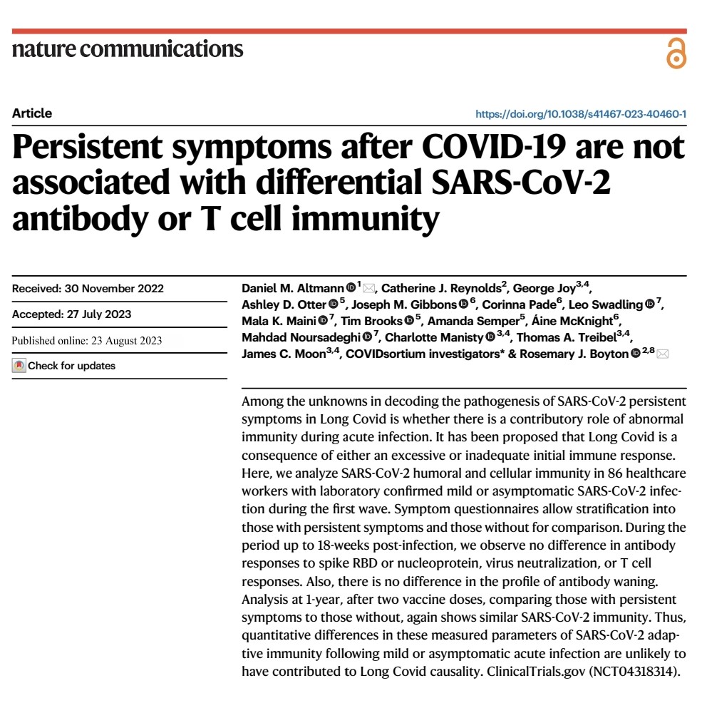 4) From @Daltmann10 and colleagues "Persistent symptoms after COVID-19 are not associated with differential SARS-CoV-2 antibody or T cell immunity" https://www.nature.com/articles/s41467-023-40460-1 This is a mysterious study, as the researchers did not find any differences in the immune system's response