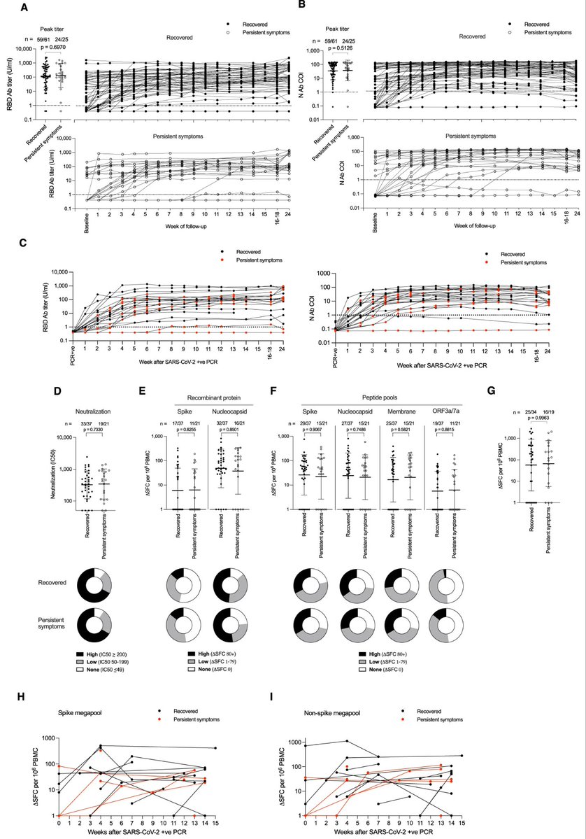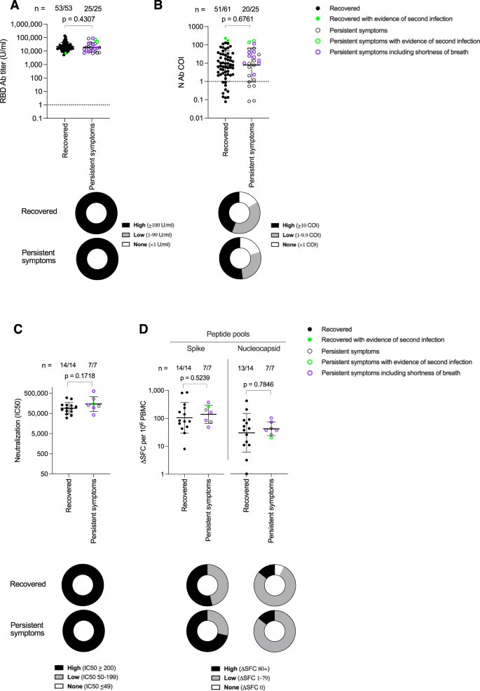 5) ...to the initial COVID-19 infection between those who went on to develop persistent Long COVID symptoms and those who fully recovered. Specifically: 1. Antibody levels - The researchers found no differences in peak antibody levels against the spike and nucleocapsid proteins