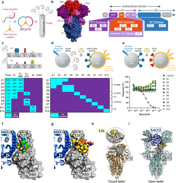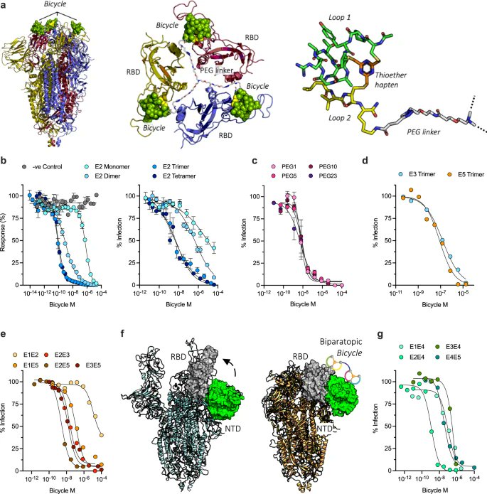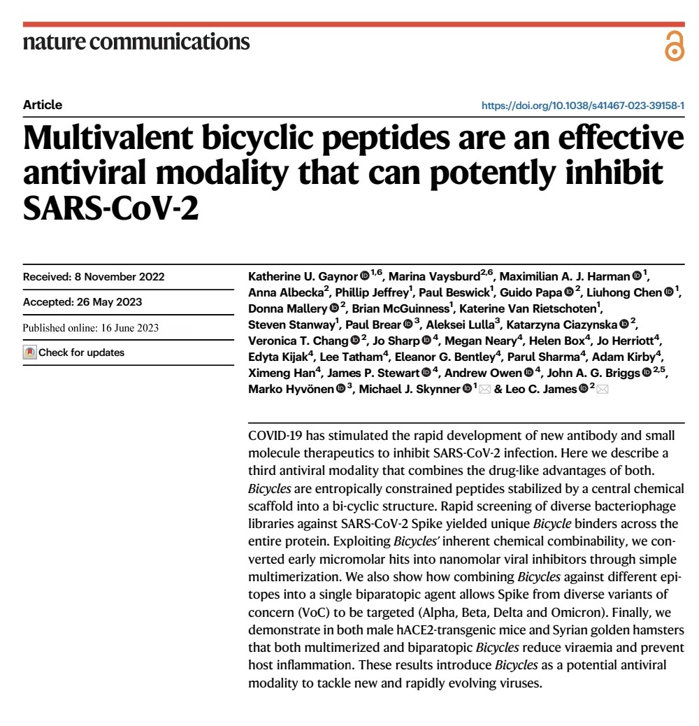 8) ...multimerized or combined into biparatopic formats to enhance affinity and access new inhibitory mechanisms. Bicycles potently inhibited infection and viral replication in vitro and in animal models, including against variants of concern, while also reducing inflammation.