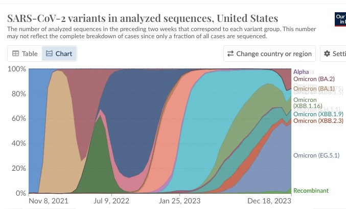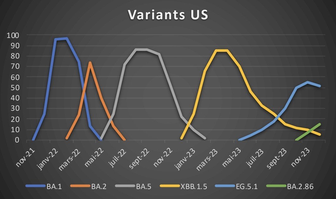 3) For this analysis, we retained the 5 large families of variants in the US post BA.1*: BA.2*, BA.5*, XBB.1.5*, EG.5.1* and BA.2.86* For simplicity we have inputed the % of sequences on a biweekly frequency.
