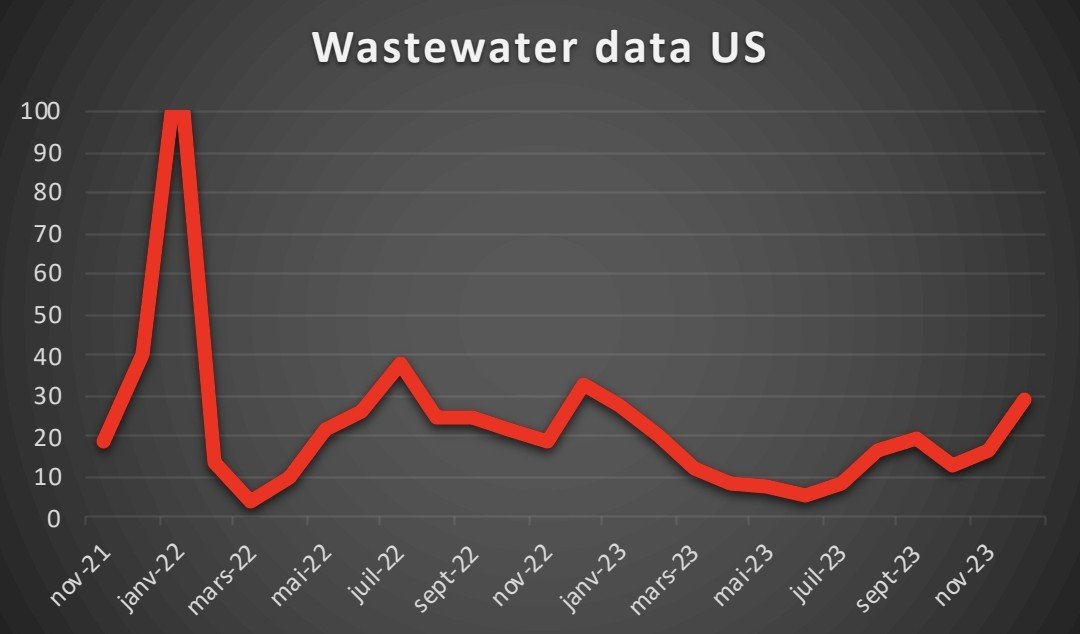 4) Then we re-processed the Biobot data by taking 3.665 copies/ml as base 100, which is almost the highest value of viral circulation since 2 years.