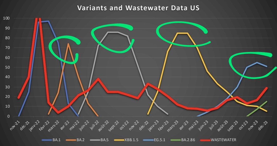 VARIANTS and WASTEWATER : SOMETHING HAS CHANGED ! Since Omicron, we have witnessed a "desynchronization", between the emergence of variants and the waves, between the intra-host and inter-host transmission. We took the example of the US to try to explain this phenomenon.