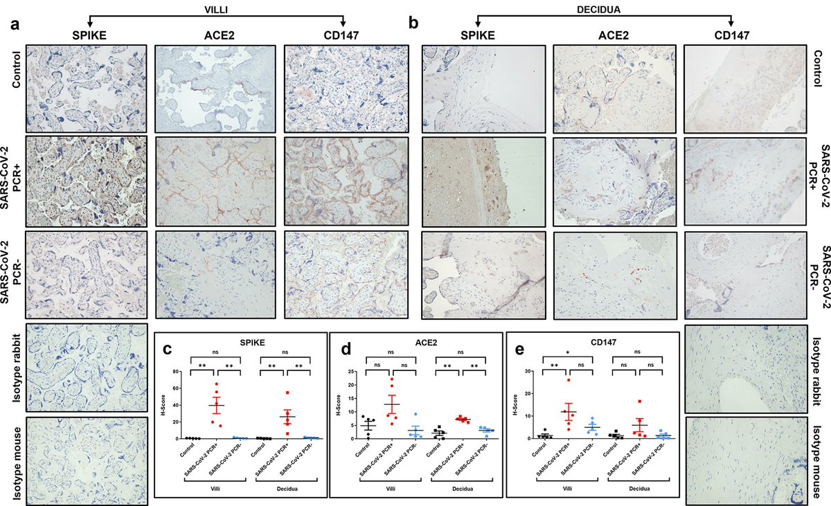 3) ...no longer positive, and uninfected controls. Key findings: - The SARS-CoV-2 spike protein was only detected in placentas of actively infected women. - Proteins that allow the virus to enter cells (ACE2, CD147) were increased in infected groups. https://t.co/lC2CYFwuMe