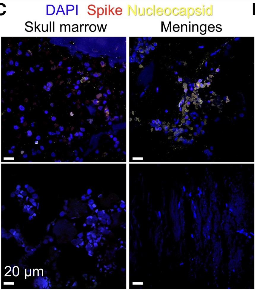 3) Here are the confoncal images showing SARS-CoV-2 spike and nucleocapsid proteins in skull marrow and meninges of COVID-19 patients, indicating viral presence in these brain border regions. https://t.co/pIJpQN2JCr