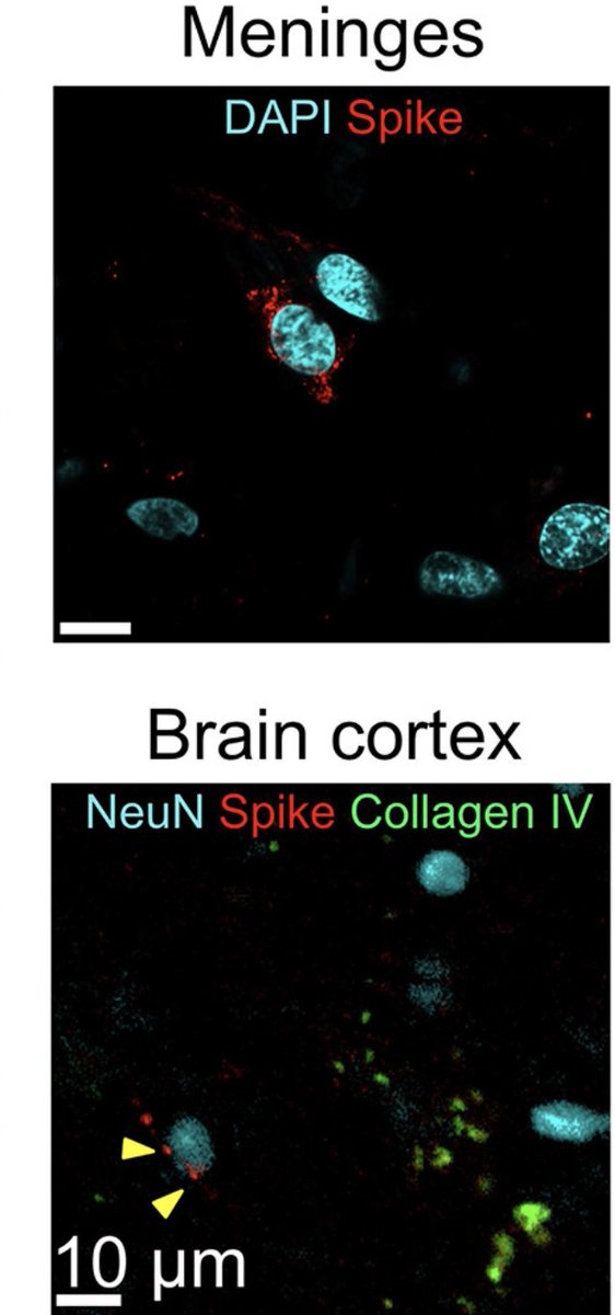 4) This figure shows SARS-CoV-2 spike protein near the nuclei of neurons and meningeal cells in the brain cortex of COVID-19 patients, suggesting viral interaction with brain cells. https://t.co/OZANFOdH5B
