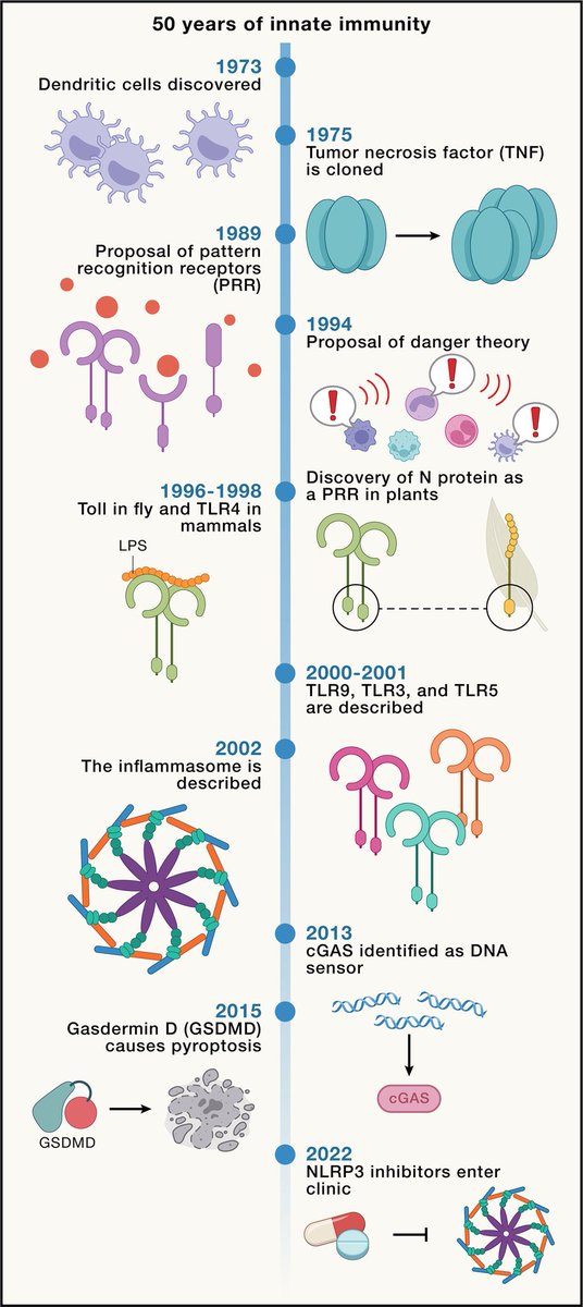 3) Major discoveries include pathogen recognition receptors (PRRs) like Toll-like receptors (TLRs) and Nod-like receptors (NLRs), which detect pathogens and damage. This links innate and adaptive immunity. https://t.co/ybMI7w0thl