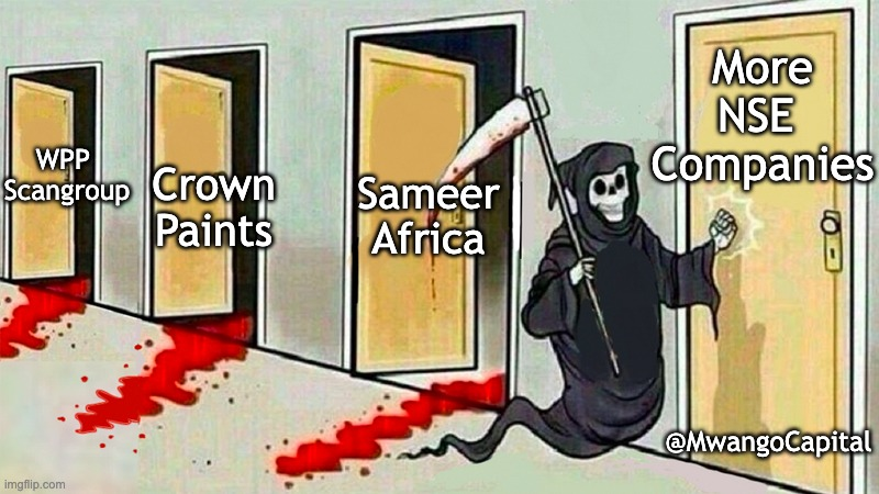 6. Sameer Africa, Crown Paints, and WPP Scangroup are the latest listed companies to issue profit warnings to their investors. This brings to 12 the number of listed firms that are anticipating substantially lower earnings this year. #MwangoMemes