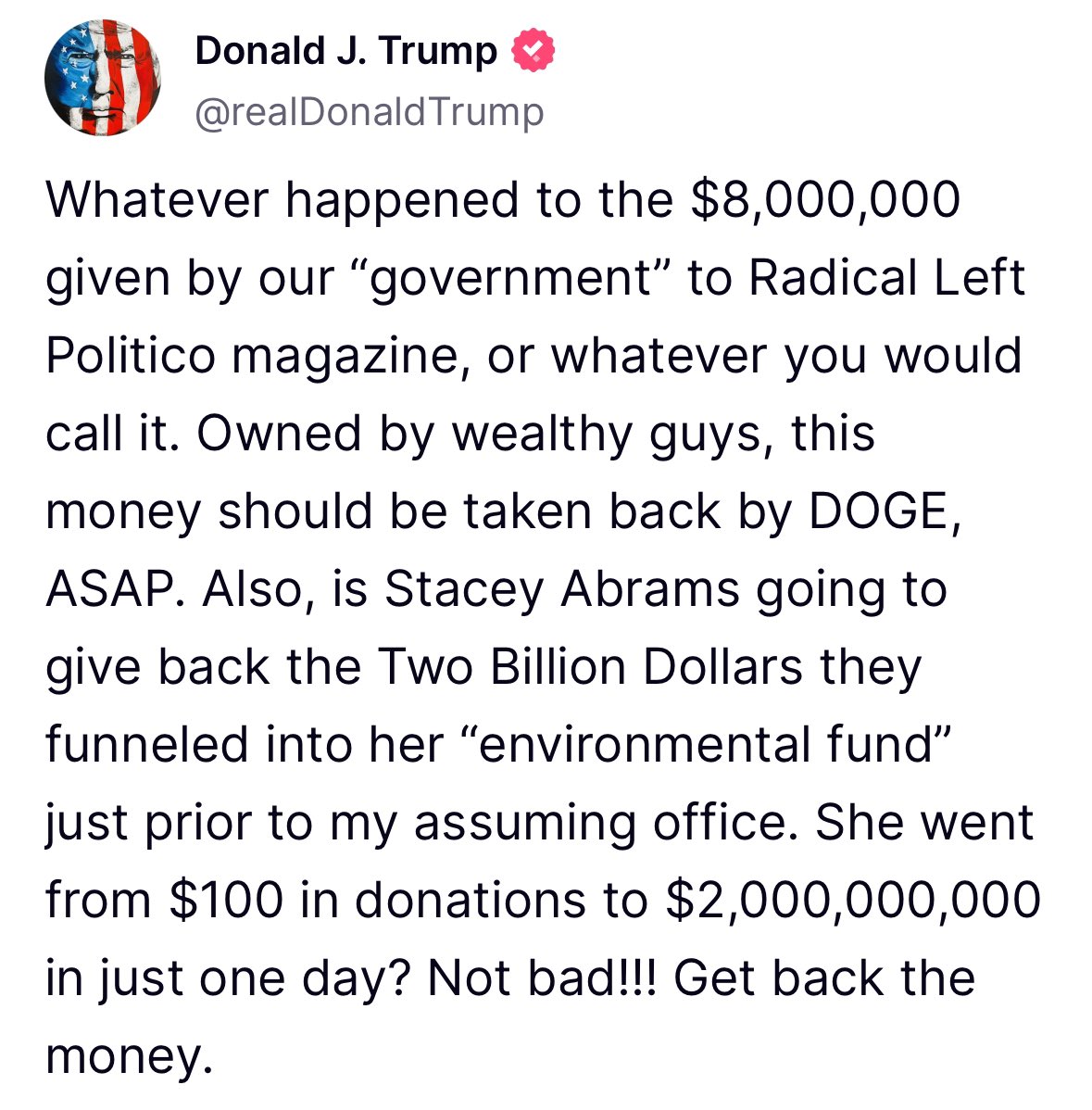 I have terminated the $2 BILLION Biden EPA grant to this Stacey Abrams-linked NGO. The DOJ/FBI are investigating and the money has been frozen. It is insane that the Biden Admin would give $2B to an organization that previously only received $100!
