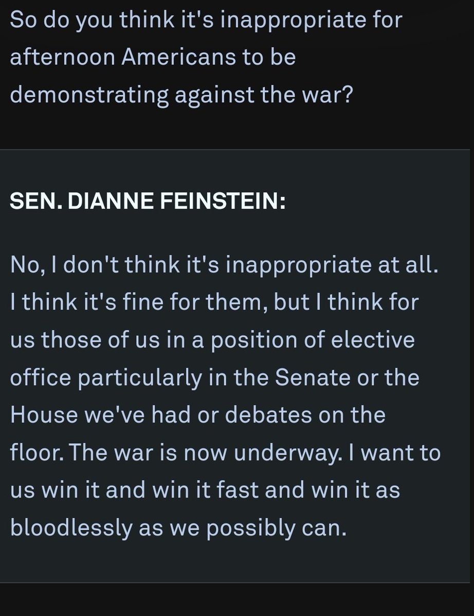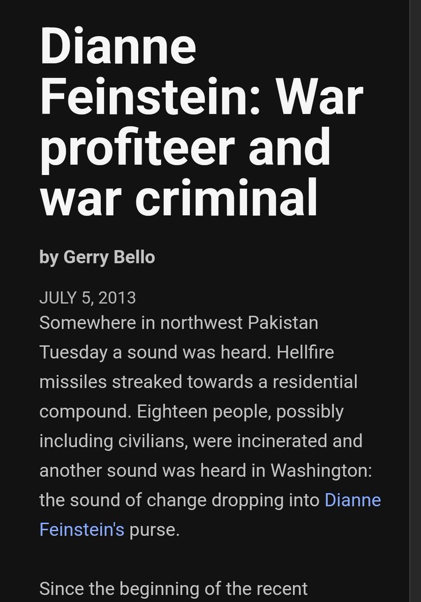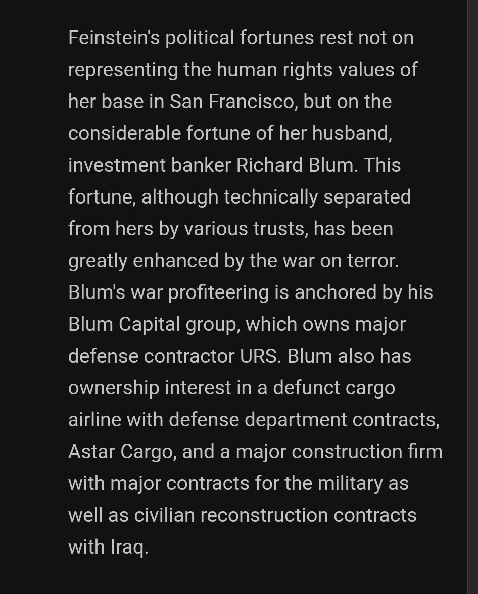 Her husband would always profit from the wars she supported https://freepress.org/article/dianne-feinstein-war-profiteer-and-war-criminal