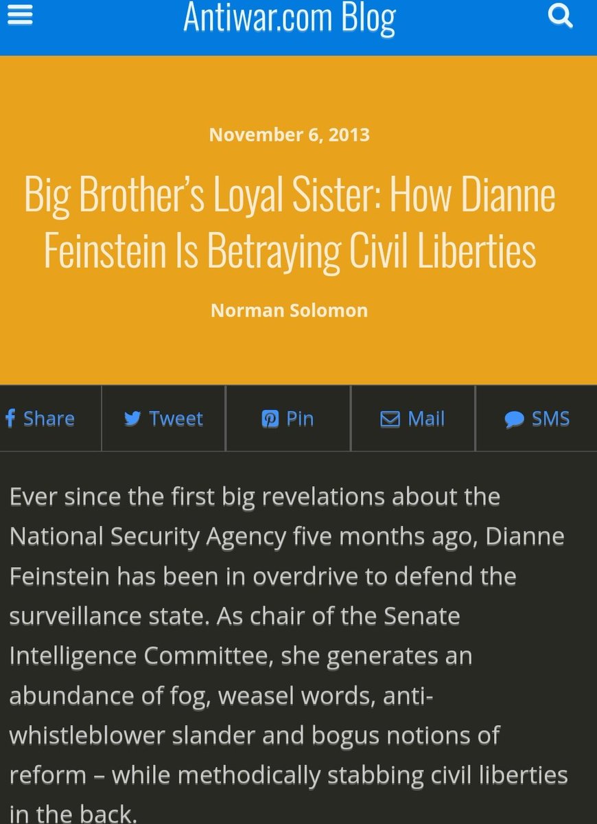 She enacted all spying measures https://www.antiwar.com/blog/2013/11/06/big-brothers-loyal-sister-how-dianne-feinstein-is-betraying-civil-liberties/