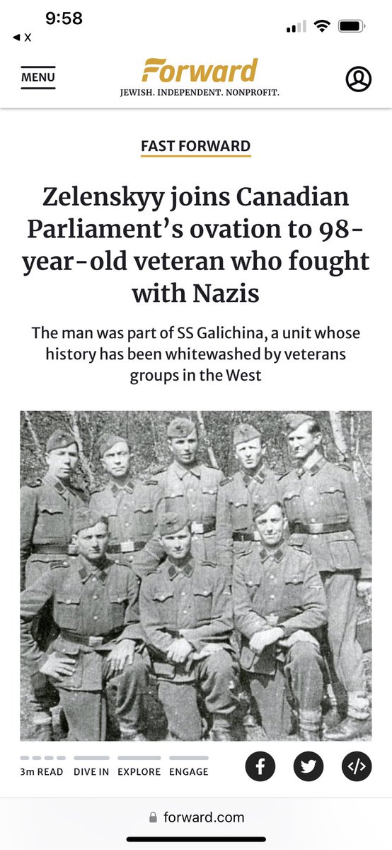 14. As usual, if it’s a report about Trudeau’s misconduct, you’ll read about it in the foreign press before you’ll read about it (if ever) in Canada’s news media, which has been colonized by Trudeau: https://forward.com/fast-forward/561927/zelenskyy-joins-canadian-parliaments-ovation-to-98-year-old-veteran-who-fought-with-nazis/?amp=1