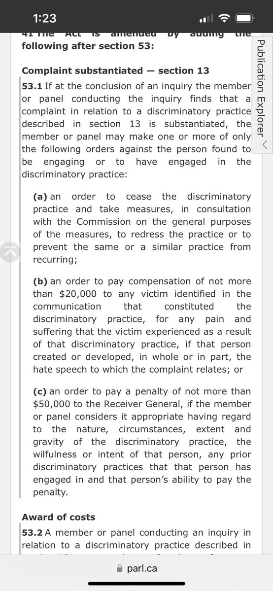 Here’s how they’re going to get you, @jordanbpeterson. For years the Canadian Human Rights Act (CHRA) has banned discrimination against people based on “gender identity or expression”. You of course have never discriminated against anyone. But this new bill adds s. 13 to the CHRA, which now says that mere speech is considered discrimination if it is “likely to foment detestation or vilification of an individual or group”. So now, if someone watches one of your YouTube videos or reads on of your tweets about, say, transgender athletes changing in the girls change room, and as a result is “likely” to have hard feelings towards trans people, that’s hate speech. That’s step 1. Here’s step 2. Any member of the public (including non-citizens) can lodge a complaint against you to the Canadian Human Rights Tribunal — an activist quasi-judicial tribunal run by non-judges, appointed by Trudeau. They can get up to $20,000 per complaint from you — and they don’t have to be the “victim”. (There doesn’t have to be a victim at all — remember it’s a future crime. They only have to show that your tweet or video is “likely to” (i.e might) cause one person to have hard feelings about another person. $20,000 that you’d pay the complainant — plus $50,000 in fines to the government. Per complaint. So there could be a new complaint for every tweet you make. Every video. And the complainants can be professional busybodies and activists — they don’t have to be a “victim”. Why wouldn’t woke activists literally file a CHRA complaint after every single thing you do or say on social media? It’s free. There’s no limit. Even if you “win”, you lose — the process is the punishment. And of course, they’re going to win. This will become an industry — to enrich woke grifters and destroy you financially. But here’s the truly amazing part: the complainants can keep their identity a secret from you. Secret testimony from secret witnesses — who get paid up to $20,000 to take a run at you. That’s how they’re going to come for you — and for us at @RebelNewsOnline. See screenshots. 1. Source: https://www.parl.ca/DocumentViewer/en/44-1/bill/C-63/first-reading 2. Sign our petition at http://www.StopTheCensorship.ca.