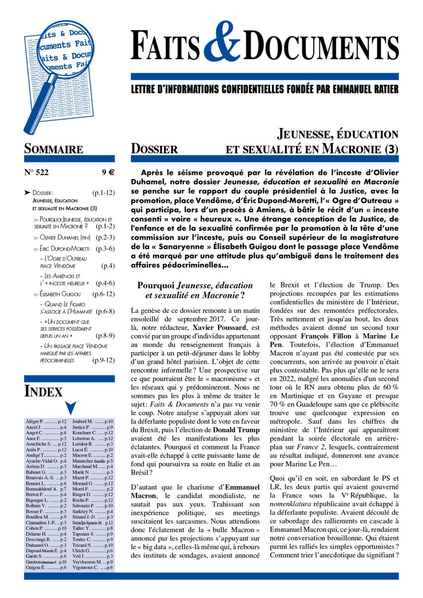 À retrouver dans le n° 522 de Faits & Documents, la suite de notre dossier « Jeunesse, éducation et sexualité en Macronie », une enquête explosive où l’inceste revient comme un leitmotiv… Dossier : Jeunesse, éducation et sexualité en Macronie (3) https://faitsetdocuments.com