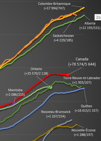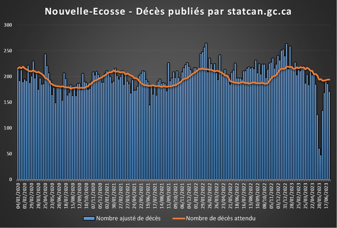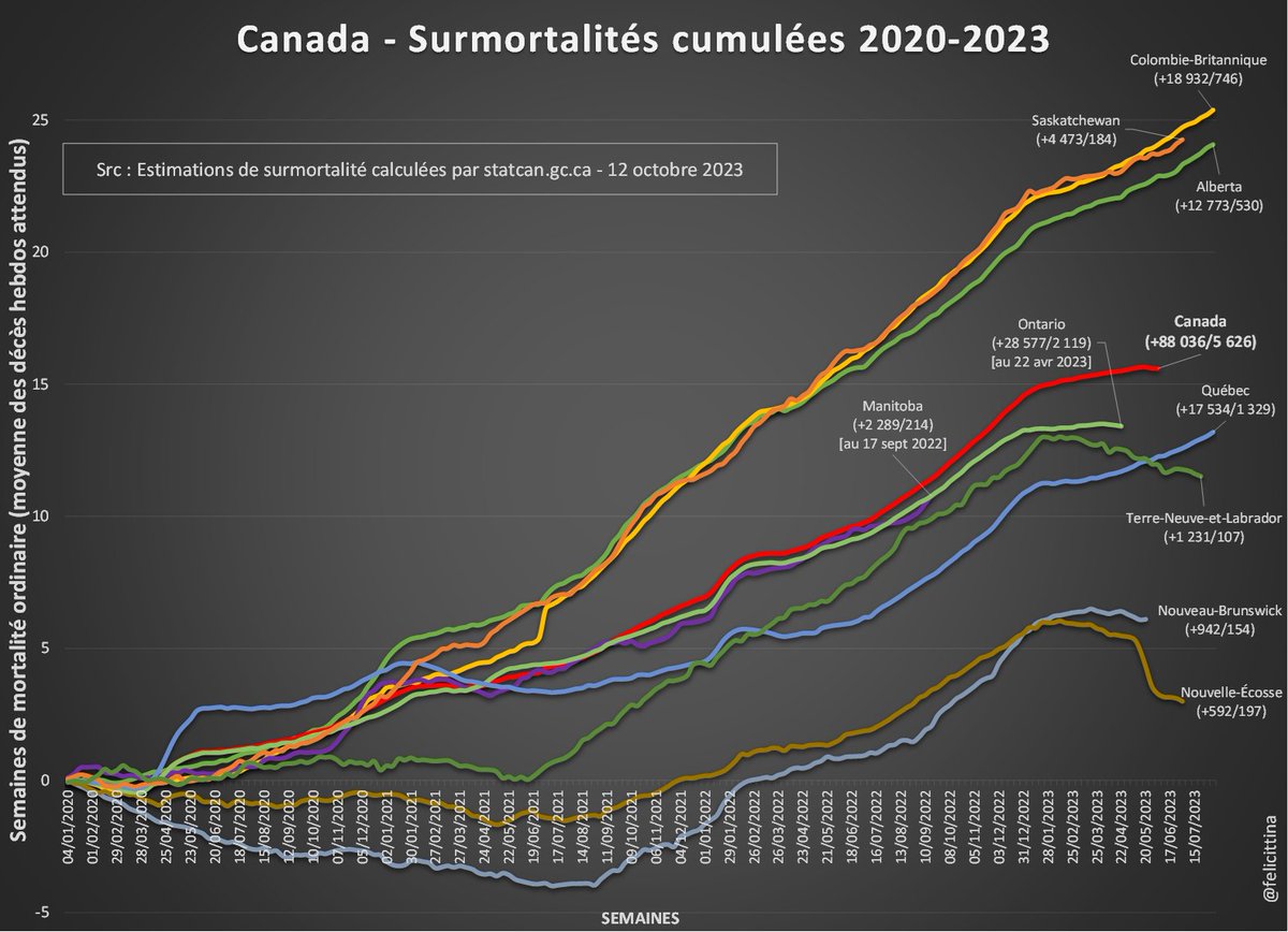 A part ça, je sais toujours pas comment le Canada entier réussit à avoir une surmortalité qui baisserait un peu alors que toutes les provinces continuent à monter… Ni comment ils calculent leurs chiffres récents sans avoir ceux d'Ontario et Manitoba (42% de la population). [5/5] https://t.co/hPJFRyJq7u