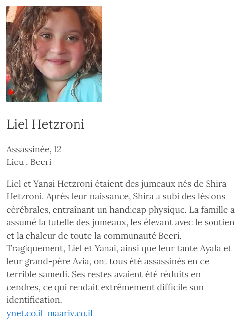 La vidéo mentionne les prénoms de deux de ces enfants, Liel et Yanai, hurlant sous les bombardements. Le rapprochement des différents récits fait aussi 😱 https://oct7map.com/LielHetzroni [3/5]