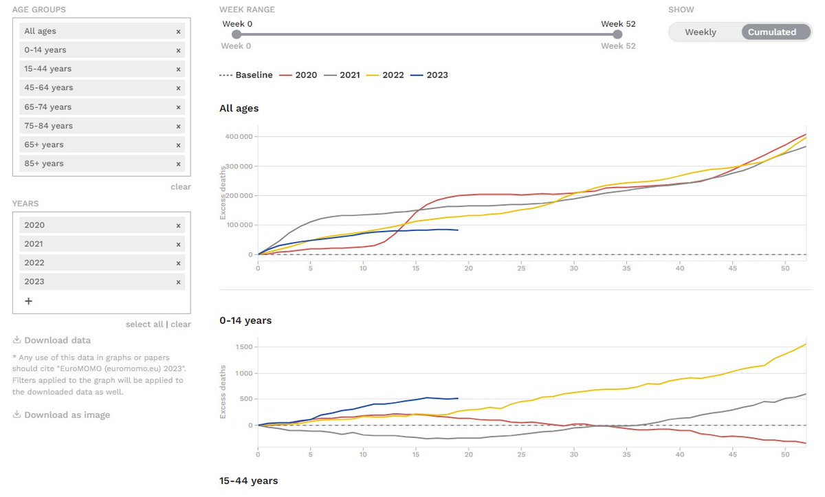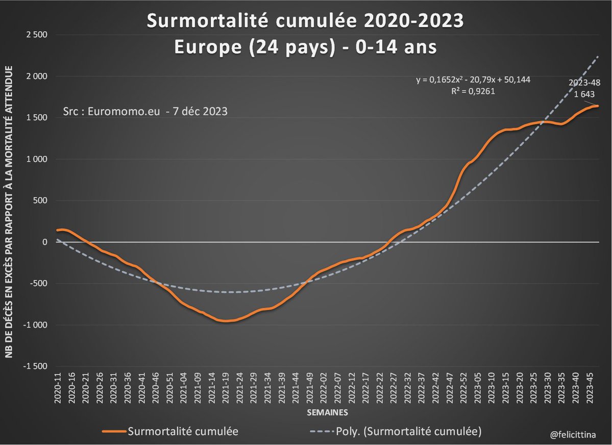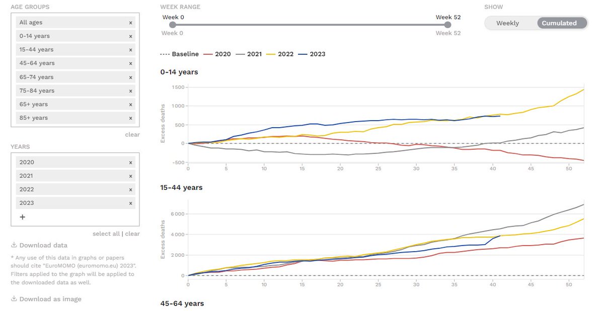 Source : Ces courbes sont obtenues tout simplement en raccordant les courbes annuelles de surmortalité cumulée d'#euromomo. Car, malheureusement, ce compteur ne peut être remis à zéro que par des sous-mortalités, pas par le 🎅… https://euromomo.eu/graphs-and-maps/#excess-mortality [5/9]